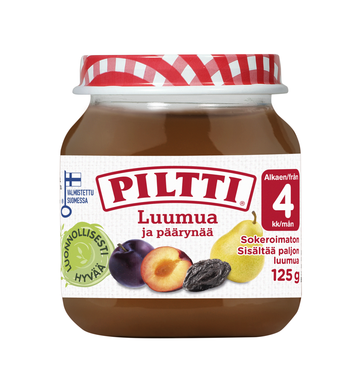 PILTTI Luumua ja päärynää on täyteläinen ja pehmeä hedelmäsose, joka soveltuu jälkiruuaksi tai välipalaksi vauvalle 4kk iästä alkaen. Hedelmäsose on sokeroimaton ja se sisältää paljon luumua!