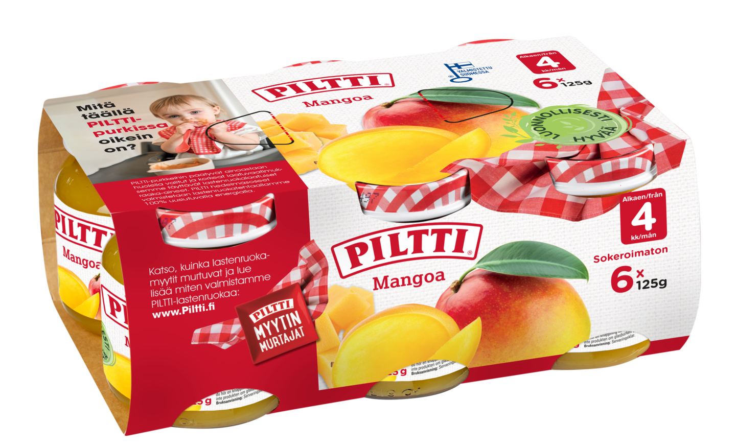 GluteenitonPiltti Mangoa on yksi suosituimmista Piltti –tuotteistamme. Se on herkullinen mangosta tehty sose. Tuote on sokeroimaton ja sisältää runsaasti C-vitamiinia. Lapsille 4 kuukauden iästä alkaen.