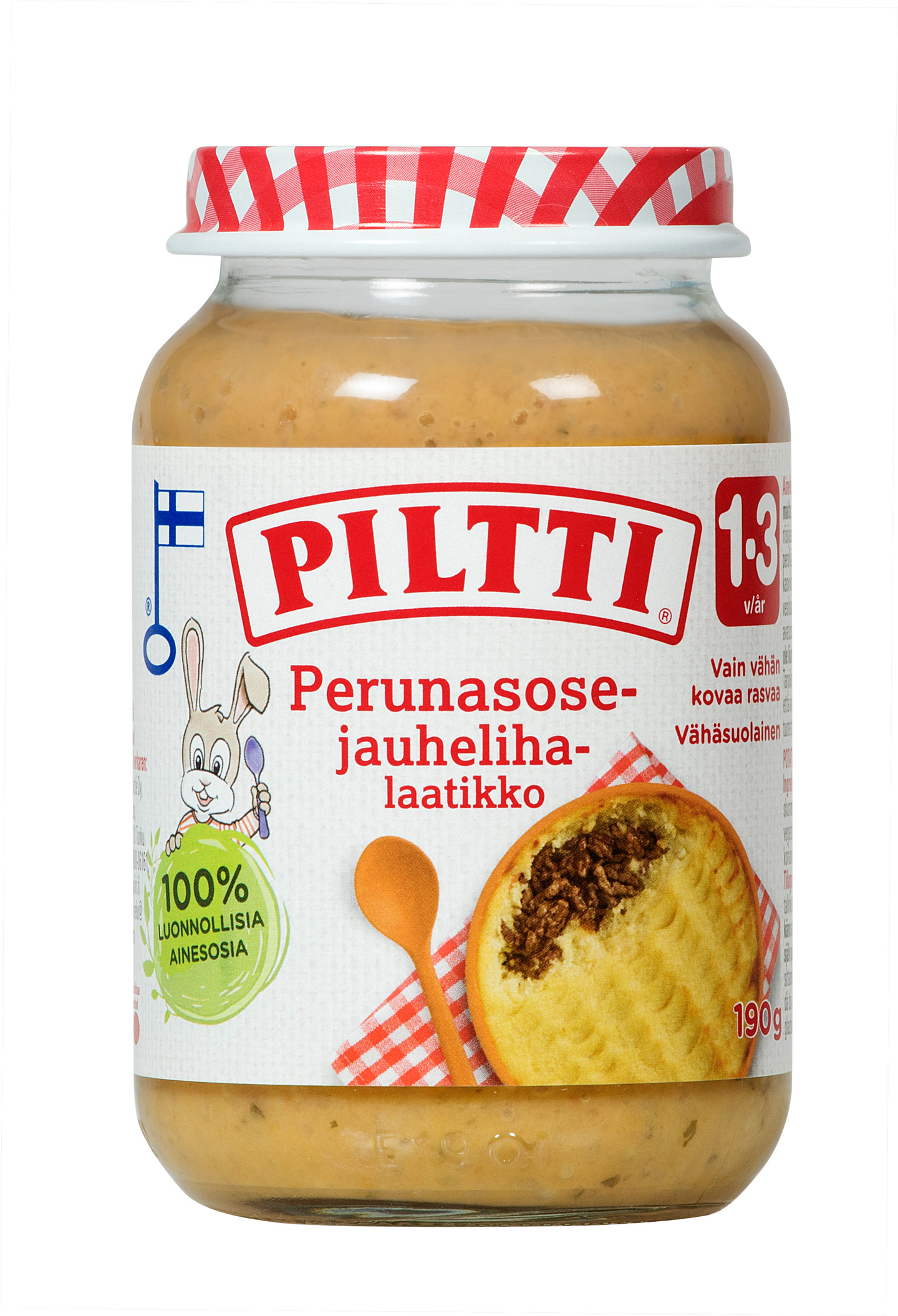 Piltti Perunasosejauhelihalaatikko on maukas ateria perunasta, bataatista, naudanlihasta ja sipulista. Lisää makua ateriaan tuo persilja. Tuotteessa on vain vähän kovaa rasvaa, ja se sopii vauvoille 12 kuukauden iästä alkaen. Tuotteen kasvispitoisuus on 54%. Valmistettu Suomessa 100% luonnollisista raaka-aineista.