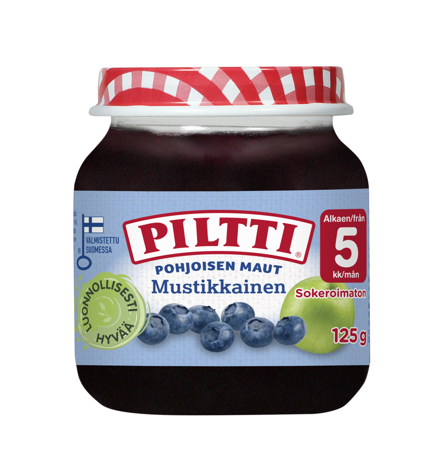 PILTTI Pohjoisen Maut Mustikkainen on raikas metsämustikasta ja omenasta valmistettu välipalasose, joka on suunniteltu erityisesti Pohjoisen pikkuisille. Soseen marja- ja hedelmäpitoisuus on 80%, eikä sose sisällä lainkaan lisättyä sokeria tai makeita mehutiivisteitä. PILTTI Pohjoisen Maut Mustikkainen hedelmäsose soveltuu jälkiruoaksi ja välipalaksi vauvalle 5 kk iästä alkaen. Lisäämällä tätä herkullista sosetta PILTTI-lastenpuuron joukkoon saat helposti maukkaan välipalan myös isommalle lapselle. PILTTI lastenruokien reseptit kehitetään eri ikäryhmien ravitsemus- ja koostumustarpeisiin sopiviksi, suomalaisten ravitsemussuositusten ja säännösten mukaan. Vastuullisuus on meille tärkeää! Vastuullisuus on meille Piltillä tärkeää ja olemme ylpeitä Turun lastenruokatehtaastamme. Kaikki lasipurkkituotteemme valmistetaan Turun lastenruokatehtaallamme 100% uusiutuvalla energialla. Tehtaaltamme ei toimiteta lainkaan jätettä kaatopaikalle. Lue lisää vastuullisuudestamme www.piltti.fi Tuotekehityksemme on jatkuvaa ja tuotteen koostumusta voidaan muuttaa. Luethan sen vuoksi ainesosaluettelon pakkauksesta aina ennen ruoan tarjoamista.