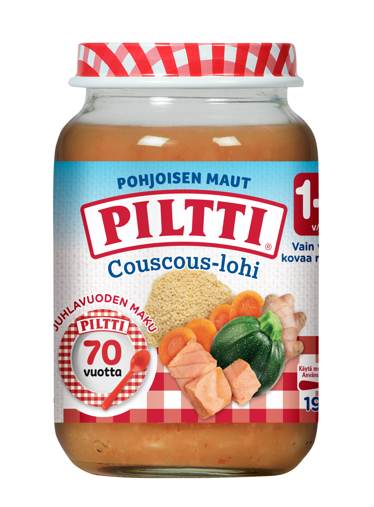 PILTTI Pohjoisen Maut Couscous-lohi 190g on ihana kala-ateria, jossa yhdistyvät kasvikset, kuskus ja villilohi. Makua ateriaan lisää inkiväärijauhe. PILTTI Pohjoisen Maut Couscous-lohi 190g on helppo ja nopea kala-ateria taaperolle 12kk iästä alkaen, ja siinä on pieniä paloja pureskelun harjoitteluun.
