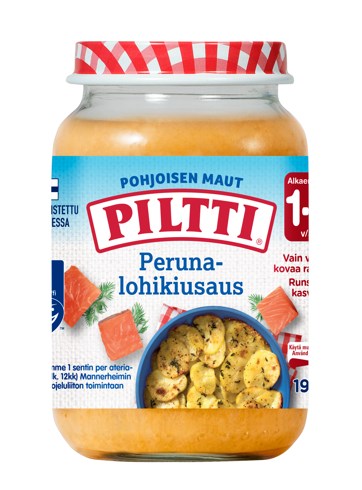 PILTTI Pohjoisen maut Kasvis-lohikiusaus on herkullinen kala-ateria perunasta, bataatista, porkkanasta ja lohesta*, ripauksella tilliä. Tämä helppo ja nopea kala-ateria soveltuu vauvalla 12kk iästä alkaen. PILTTI Pohjoisen maut Kasvis-lohikiusaus sisältää pieniä paloja pureskelun harjoitteluun.