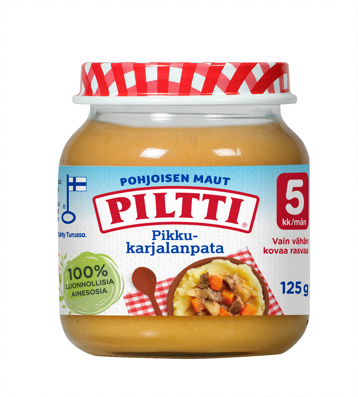 "PILTTI Pohjoisen Maut Pikkukarjalanpataa 5kk on herkullinen ateria, joka suunniteltu erityisesti Pohjoisen pienokaisten makuun sopivaksi. Perinteinen, maukas resepti sisältää runsaasti vihanneksia sekä suomalaista naudanlihaa.