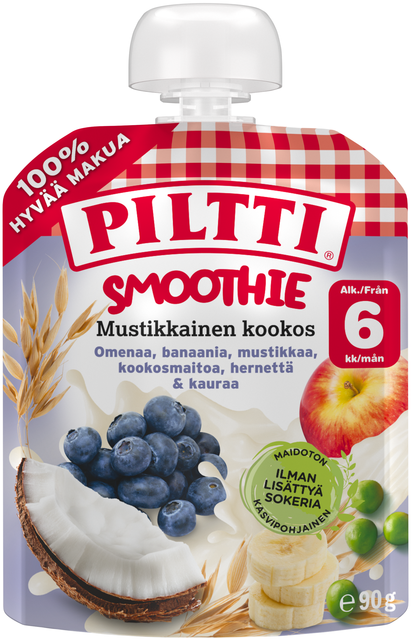 PILTTI Smoothie Mustikkainen Kookos on pehmeän samettinen kookosmaitopohjainen smoothie omenalla, banaanilla, mustikalla, herneellä ja täysjyväkauralla. Tämä herkullinen kasvipohjainen välipala ei sisällä lainkaan lisättyä sokeria ja se on myös maidoton. PILTTI Smoothie Mustikkainen Kookos soveltuu jälkiruoaksi ja välipalaksi vauvallesi 6kk iästä alkaen. PILTTI annospussit ovat käteviä välipaloja vauvoille ja lapsille sekä kotona että reissussa. PILTTI annospussit ovat myös helppo tapa nauttia osa päivittäisestä marja- ja hedelmätarpeesta. PILTTI lastenruokien reseptit kehitetään eri ikäryhmien ravitsemus- ja koostumustarpeisiin sopiviksi, suomalaisten ravitsemussuositusten ja säännösten mukaan. Tuotekehityksemme on jatkuvaa ja tuotteen koostumusta voidaan muuttaa. Luethan sen vuoksi ainesosaluettelon pakkauksesta aina ennen ruoan tarjoamista.