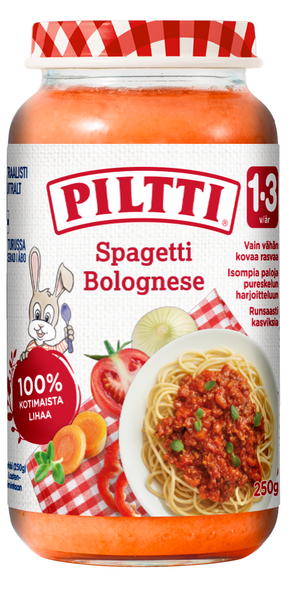 PILTTI Spagetti Bolognese ateriassa yhdistyy täysjyväspagetti ja suomalainen naudanliha herkulliseen tomaattipohjaiseen kastikkeeseen. Porkkanan ja paprikan lisäksi makua ateriaan tuovat mausteet, oregano ja valkopippuri.