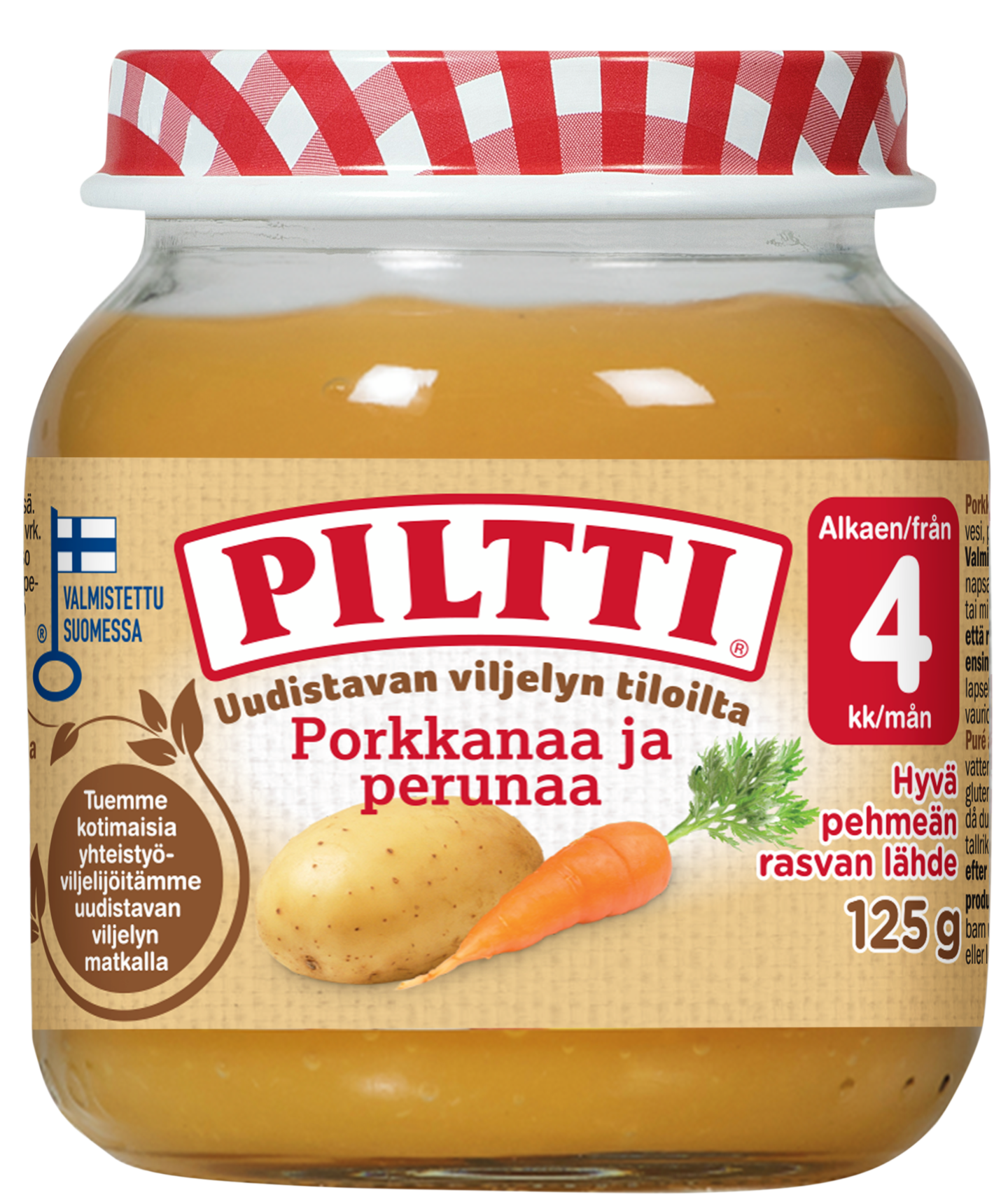 PILTTI Porkkanaa ja perunaa on Piltin ensimmäinen tuote, jonka juurekset on viljelty suomalaisilla uudistavan viljelyn tiloilla*. Herkullinen Piltti Porkkanaa ja perunaa on pienten lasten ensiateria, jossa käytetään suomalaista perunaa ja porkkanaa. Tuotteessa on runsaasti pehmeää rasvaa ja se sopii maistelun aloitteluun lapsille 4 kuukauden iästä alkaen. Ideana kotikokkailuun: voit käyttää tuotetta myös pannareiden ja keittojen valmistamisessa tuomaan kasvisten makua.