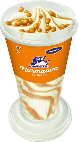 LaktoositonPingviini Hurmaava Kinuski jäätelöpikari sisältää täyteläistä laktoositonta vaniljakermajäätelöä, hurmaavaa kinuskikastiketta ja kinuskirakeita.