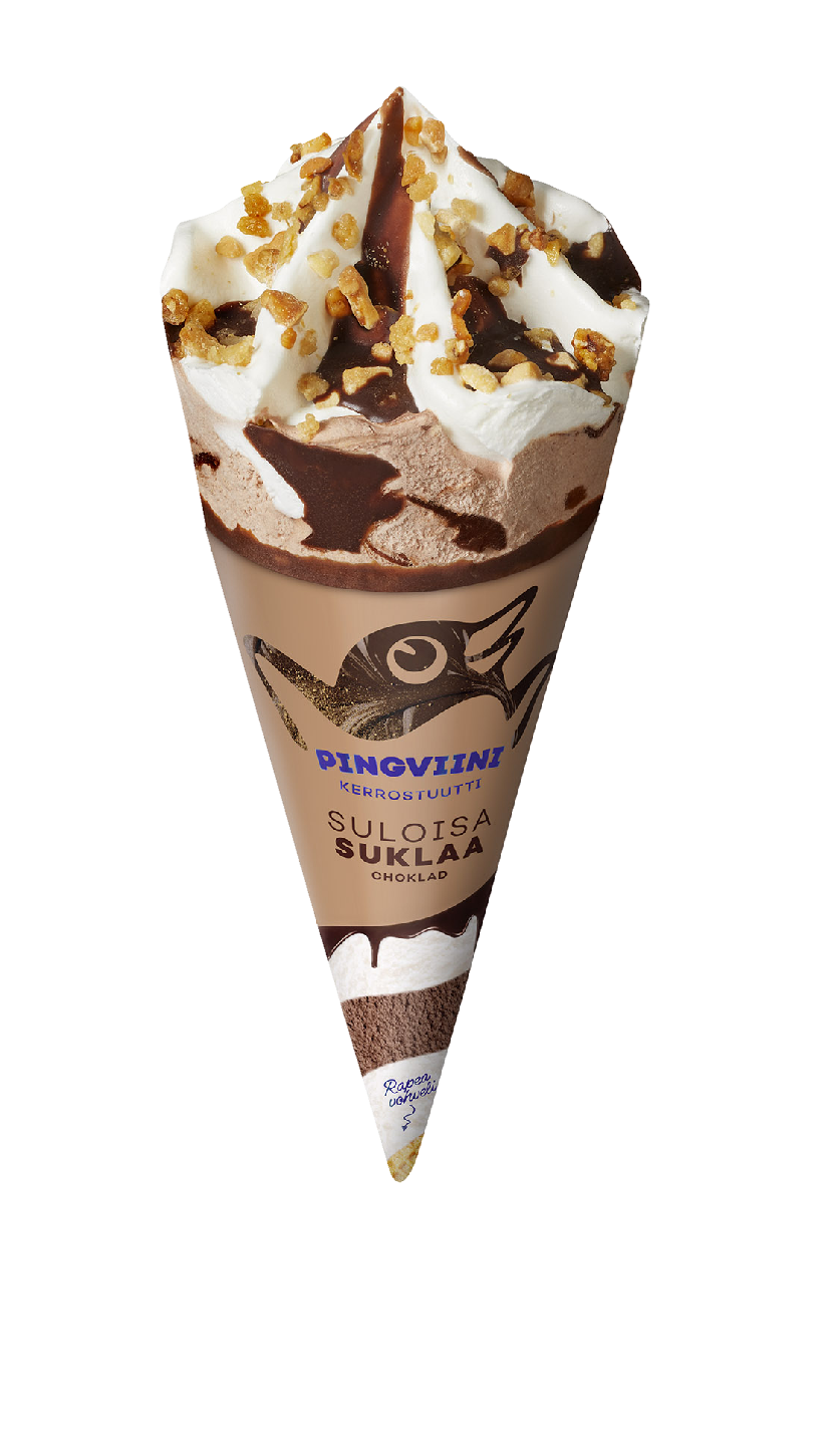 Pingviini Suklaa tuutti on suloisa kolmikerroksinen vanilja- ja suklaakermajäätelön liitto. Ensimmäisellä haukulla lumoavat vaniljakermajäätelö, suklaanmakuinen kastike sekä rouskuvat mantelikrokantit. Seuraavaksi makuelämyksessä on luvassa suklaakermajäätelöä ja tuutin saa viimeistellä raikkaalla vaniljakermajäätelöllä. Tuotteen kaakao on Rainforest Alliance -sertifioitua.
