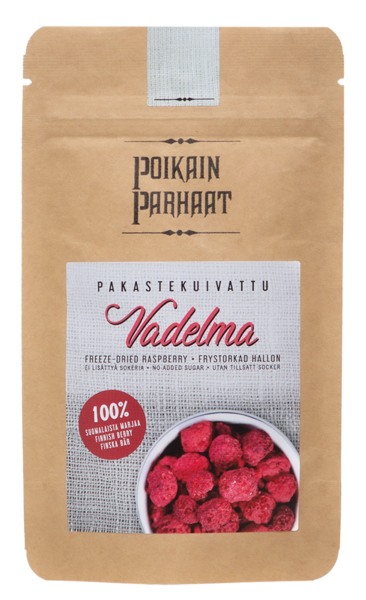 100 % suomalaista kokonaista pakastekuivattua vadelmaa. Vadelma on tasapainoisen makea ja pehmeän hapan marja, joka on täynnä vitamiineja, ravintokuituja ja herkullista makua.