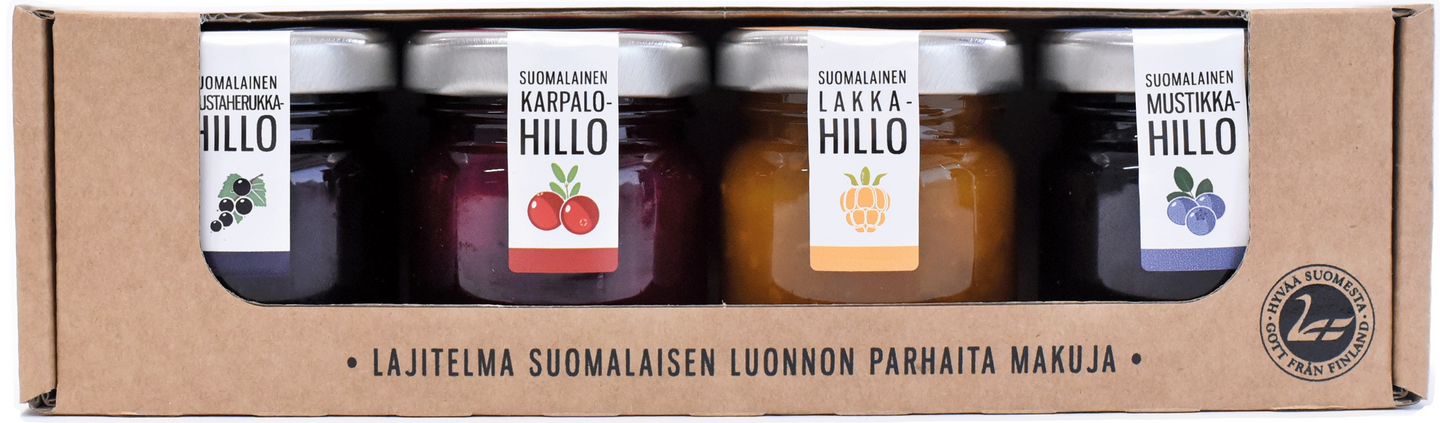 Lakka(Suomi) 75% sokeri, vesi, sakeuttamisaine (pektiini), säilöntäaine (kaliumsorbaatti). Karpalo (Suomi) 75%, sokeri, vesi, sakeuttamisaine (pektiini), säilöntäaine (kaliumsorbaatti). Mustaherukka (Suomi) 75%, sokeri, vesi, sakeuttamisaine (pektiini), säilöntäaine (kaliumsorbaatti). Mustikka (Suomi) 75%, sokeri, vesi, sakeuttamisaine (pektiini), säilöntäaine (kaliumsorbaatti).