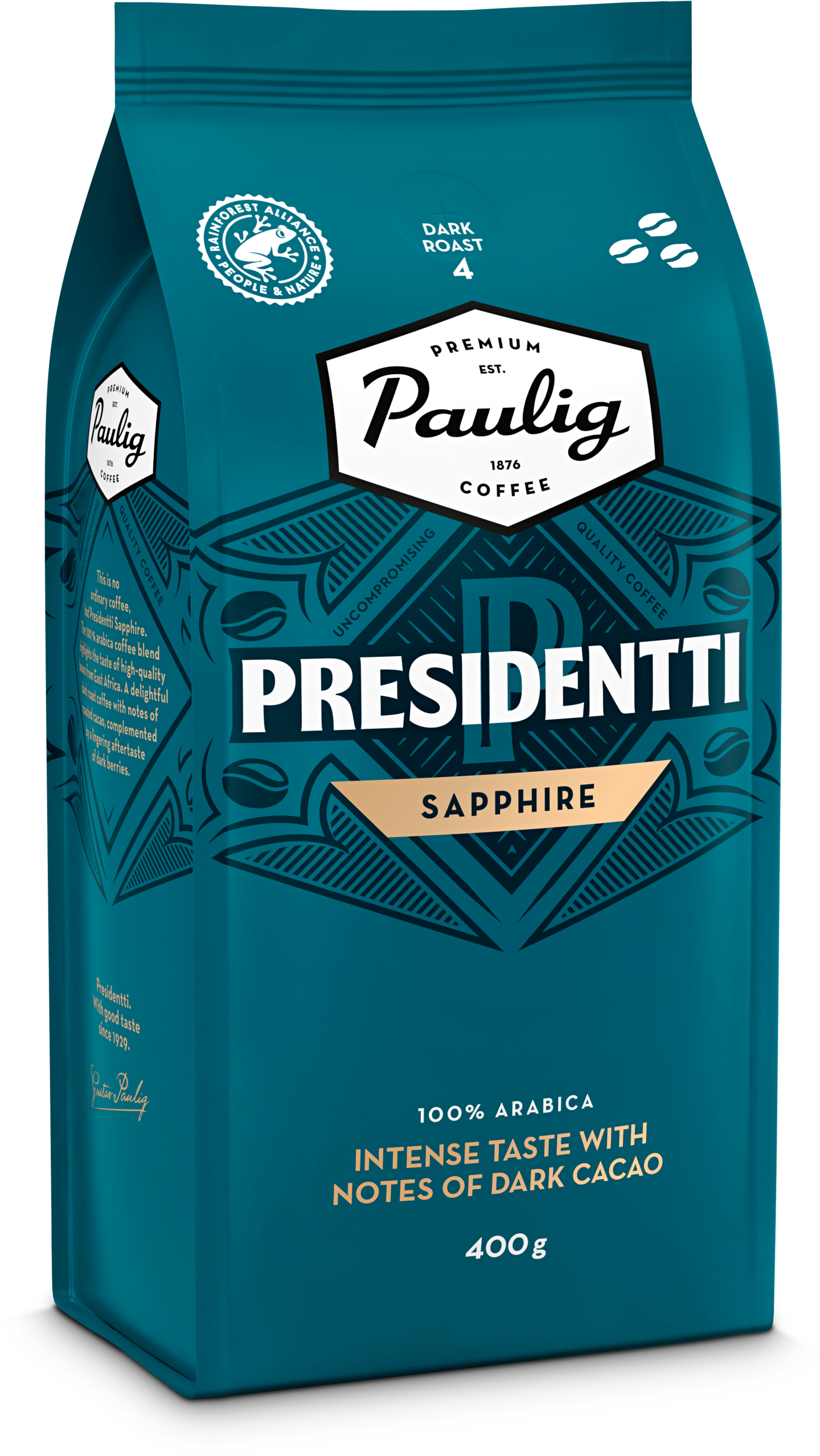 PRESIDENTTI SAPPHIRE Kädessäsi ei ole tavallinen kahvi, vaan Presidentti Sapphire. Ainutlaatuiset piirteensä kahvi saa korkealaatuisista itäafrikkalaisista 100 % arabica-kahvipavuista. Intensiivinen tummapaahtoinen kahvi hurmaa tumman kaakaoisella maulla. Viipyilevässä jälkimaussa korostuvat tummien marjojen vivahteet. Presidentti. Hyvällä maulla vuodesta 1929. Paahtoaste: 4 Rainforest Alliance -sertifioitu. Lisätietoa: ra.org.