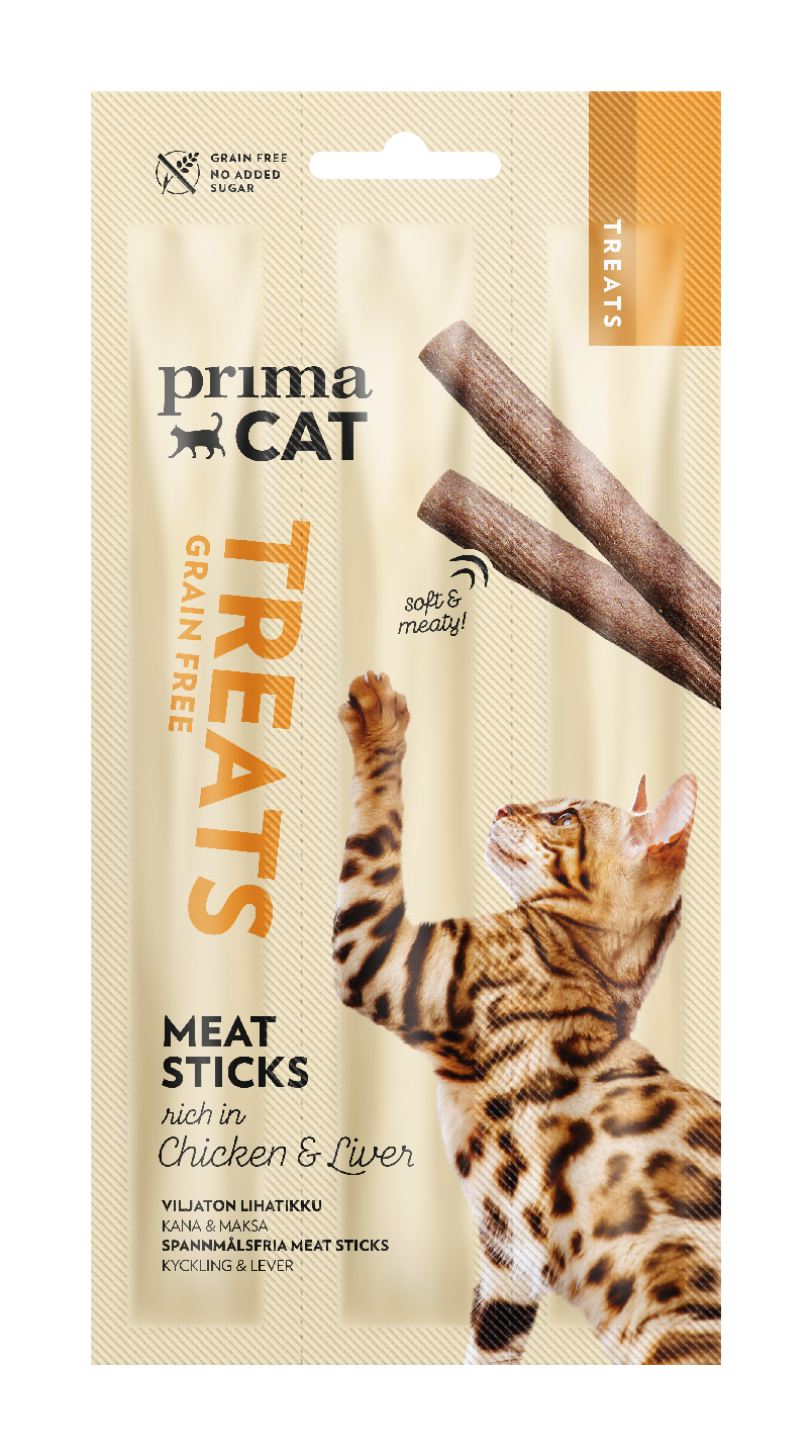 PrimaCat Meat Stick -lihatikku on lihaisa herkku rakkaalle kissallesi. Tämä kanan- ja maksanmakuinen kissanherkku on täysin viljaton, eikä siinä ole lainkaan lisättyä sokeria. Lihatikkuun lisätyt vitamiinit sekä kissalle elintärkeä tauriini auttavat tukemaan kissan hyvinvointia. Lihatikun erittäin lihaisa koostumus on mukavan pehmeä ja siitä on helppo paloitella kissan suuhun sopivia paloja, joten se sopii mainiosti kissan hemmotteluun, aktivointiin ja koulutukseen. Valmistettu Euroopassa.