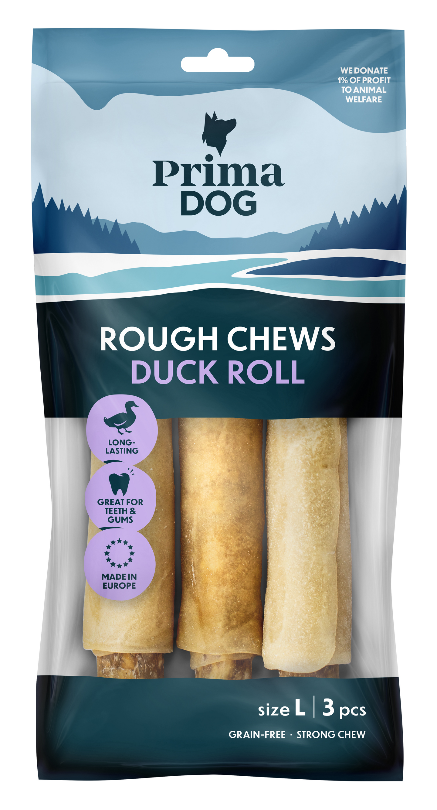 PrimaDogin Rough Chews Ankkarulla L-koossa on naudannahkainen koiran puruluu, joka on täytetty maistuvalla, ankkaa sisältävällä rouhetangolla. Tämä pitkäkestoinen puruluu tarjoaa koirallesi aktivointia ja tukee samalla koirasi suun terveyttä. Rough Chews Ankkarulla on täysin viljaton, vähärasvainen, säilöntäaineeton, ja se sisältää runsaasti proteiinia. Tämän puruluun tuoksu ja herkullinen maku houkuttelevat nirsoimmankin nelijalkaisen pureskelun pariin. Rough Chews Ankkarullaa on saatavilla myös isommille koirille sopivassa L-koossa. Kaikki PrimaDogin Rough Chews -puruluut valmistetaan Euroopassa.
