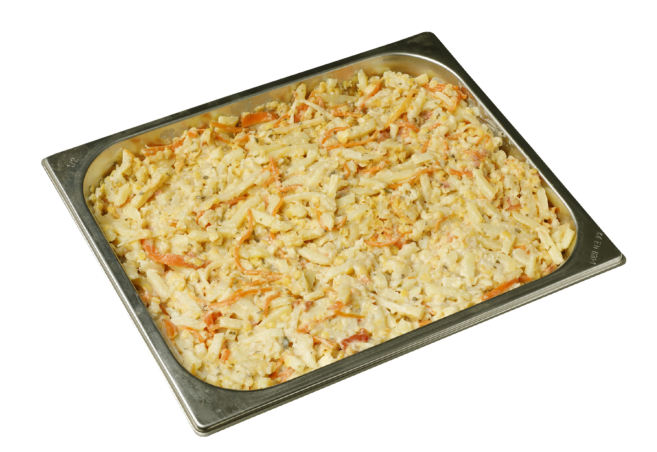 Peruna 55 % (Suomi), raejuusto (Suomi) (MAITO, KERMA, hapate, suola), linssi, laktoositon kasvirasvasekoite (rasvaton MAITO (Suomi), vesi, rapsiöljy, muunnettu maissi- ja tapiokatärkkelys, emulgointiaine (E472e), väri (E160a)), porkkana, vesi tomaattimurska, palsternakka, sipuli, jodioitu suola, valkosipuli, persilja, sokeri, rakuuna, mustapippuri, oregano, kurkuma.