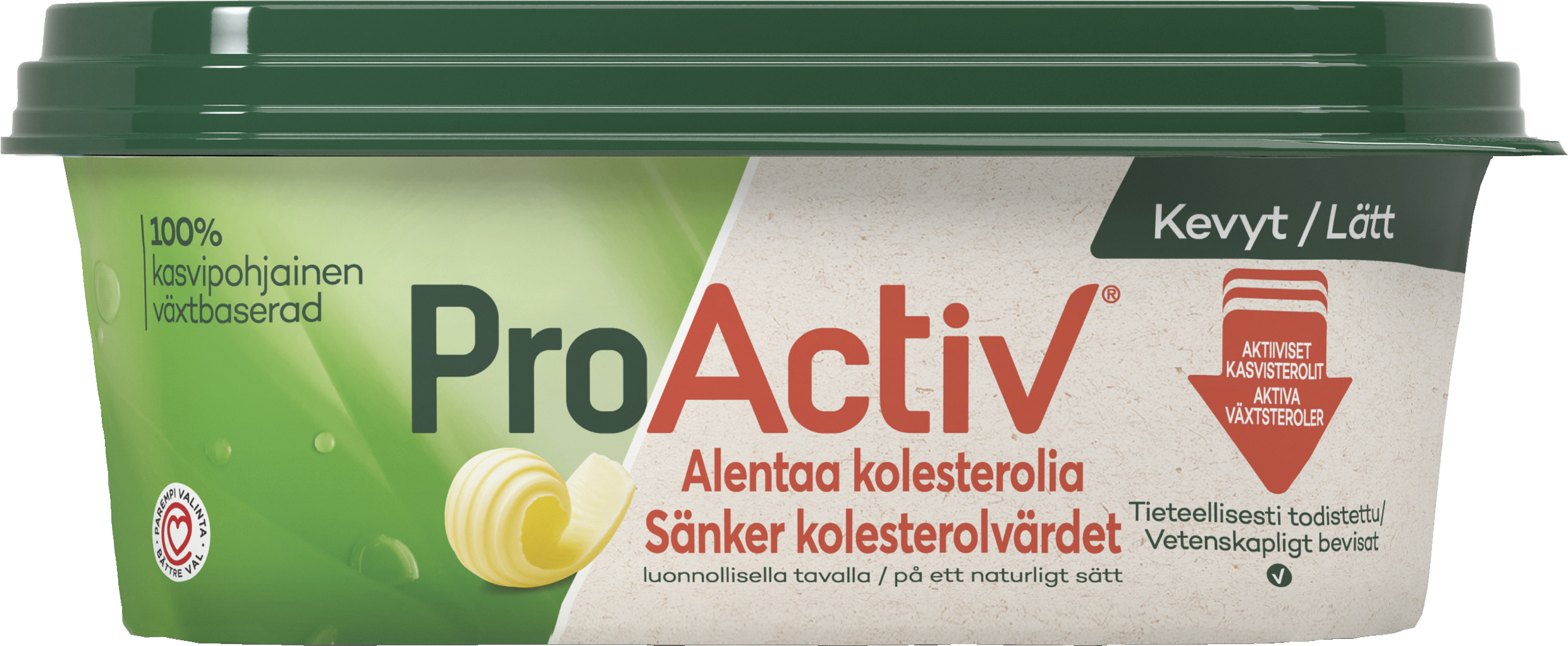 ProActiv kevyt kasvirasvalevite 35% sisältää lisättyjä kasvisteroleja, jotka alentavat aktiivisesti kolesterolitasoa. Sisältää omega-3- ja omega-6-rasvahappoja sekä A ja D vitamiineja.