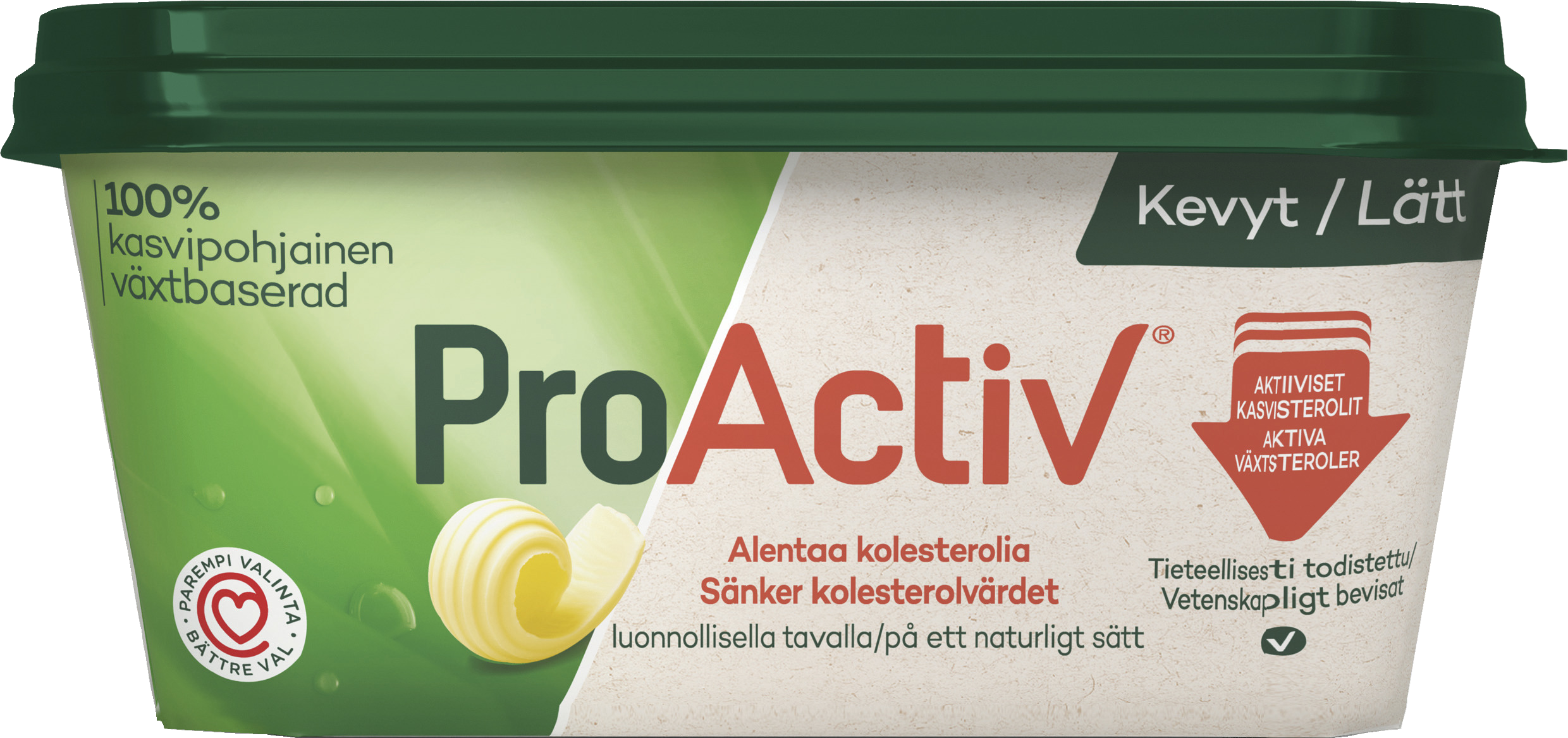 ProActiv kevyt kasvirasvalevite 35% sisältää lisättyjä kasvisteroleja, jotka alentavat aktiivisesti kolesterolitasoa. Sisältää omega-3- ja omega-6-rasvahappoja sekä A ja D vitamiineja.