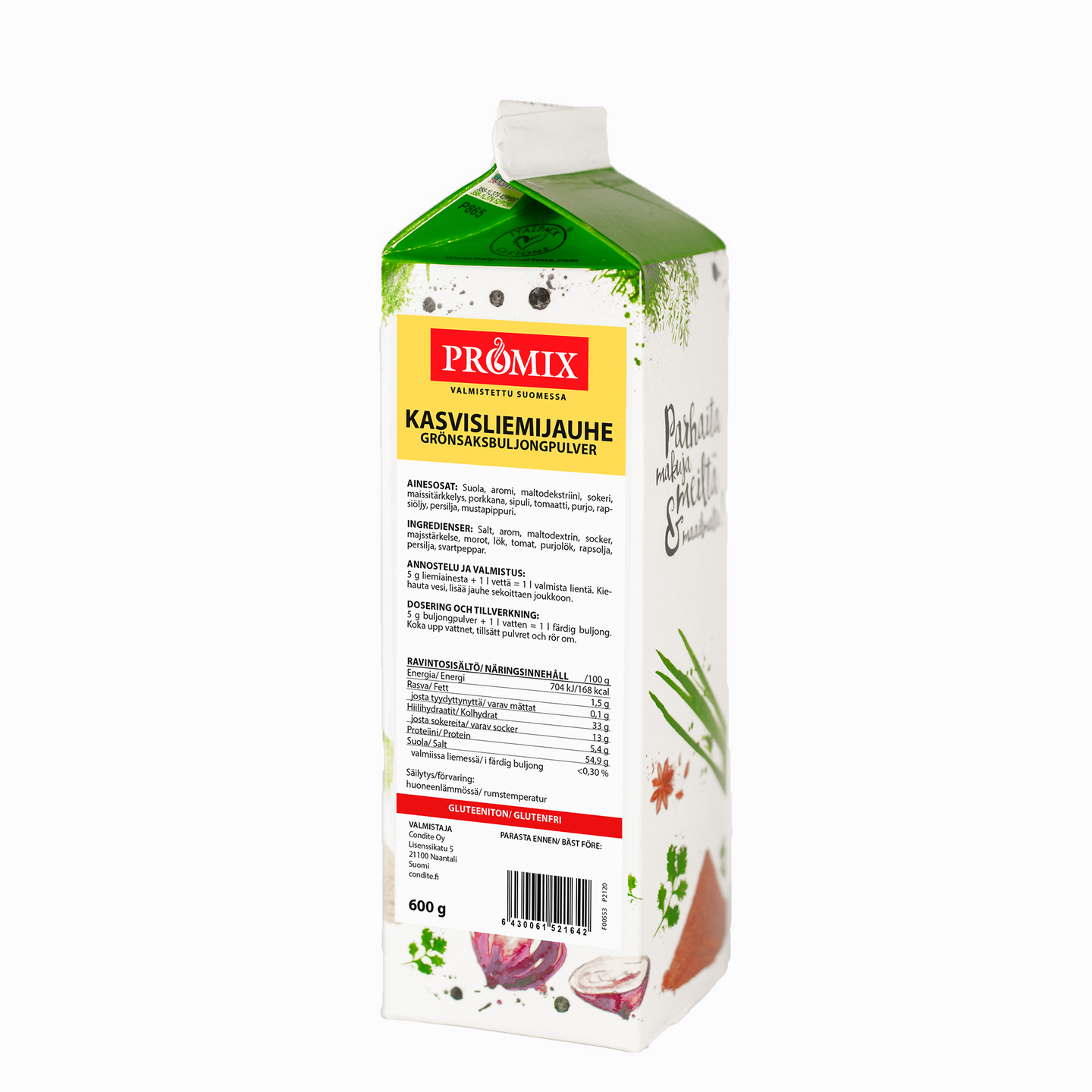 Suola, aromi, maltodekstriini, sokeri, maissitärkkelys,porkkana, sipuli, tomaatti, purjo, rapsiöljy, persilja, mustapippuri.