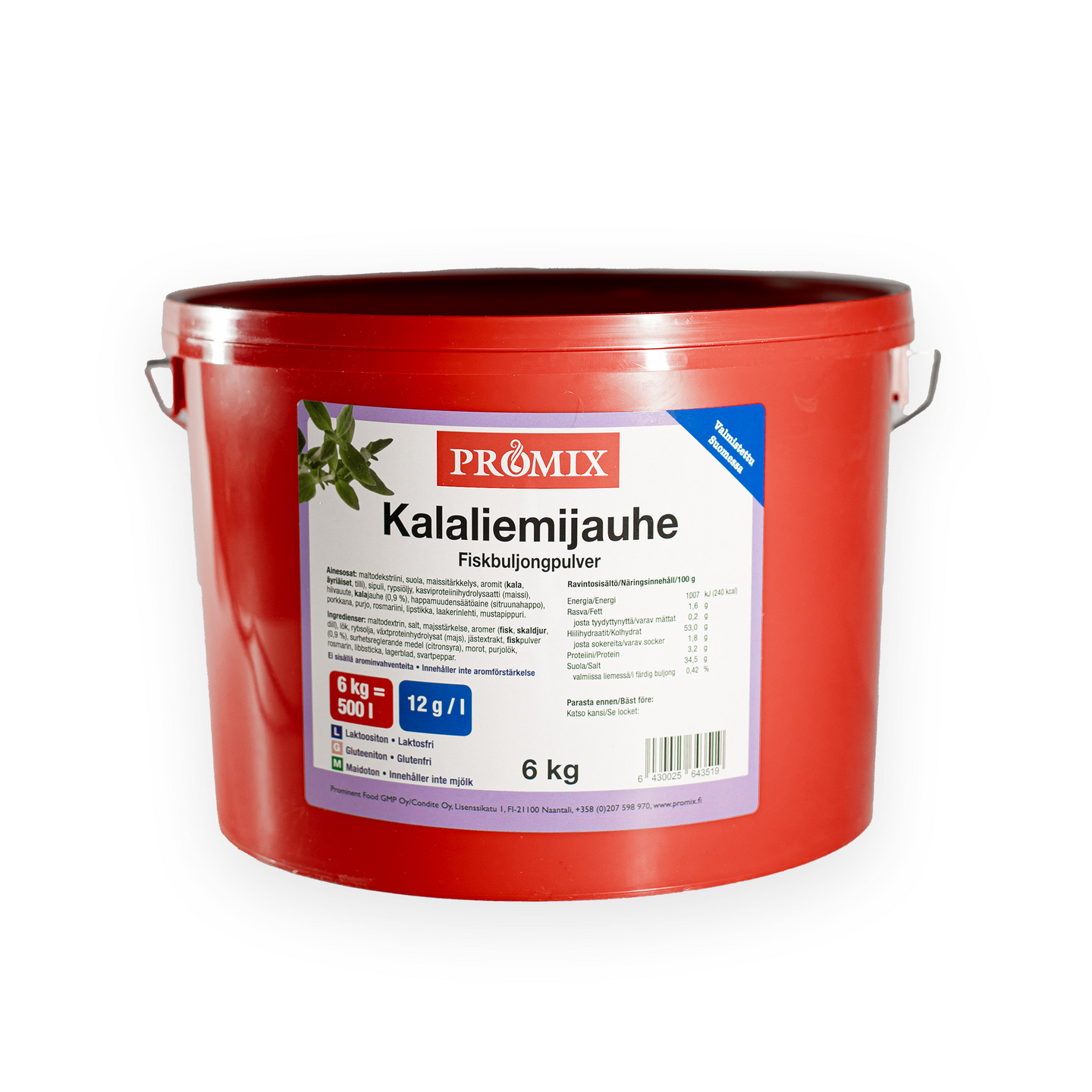 Maltodekstriini, suola, maissitärkkelys, aromit (KALA, ÄYRIÄISET, tilli), sipuli, rapsiöljy, kasviproteiinihydrolysaatti (maissi), hiivauute, KALAJAUHE (0,9% EU), happamuudensäätöaine (sitruunahappo), porkkana, purjo, rosmariini, lipstikka, laakerinlehti, mustapippuri. Valmiin tuotteen suolapitoisuus on 0,4%.