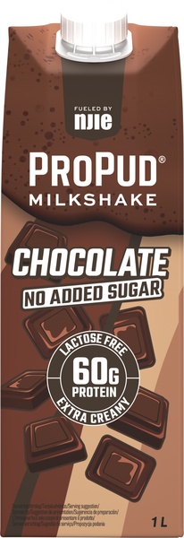 ProPud Protein Milkshake Chocolate - kermainen ja pehmeä suklaanmakuinen proteiinipirtelö. Ei lisättyä sokeria, laktoositon ja 60 g proteiinia per pakkaus