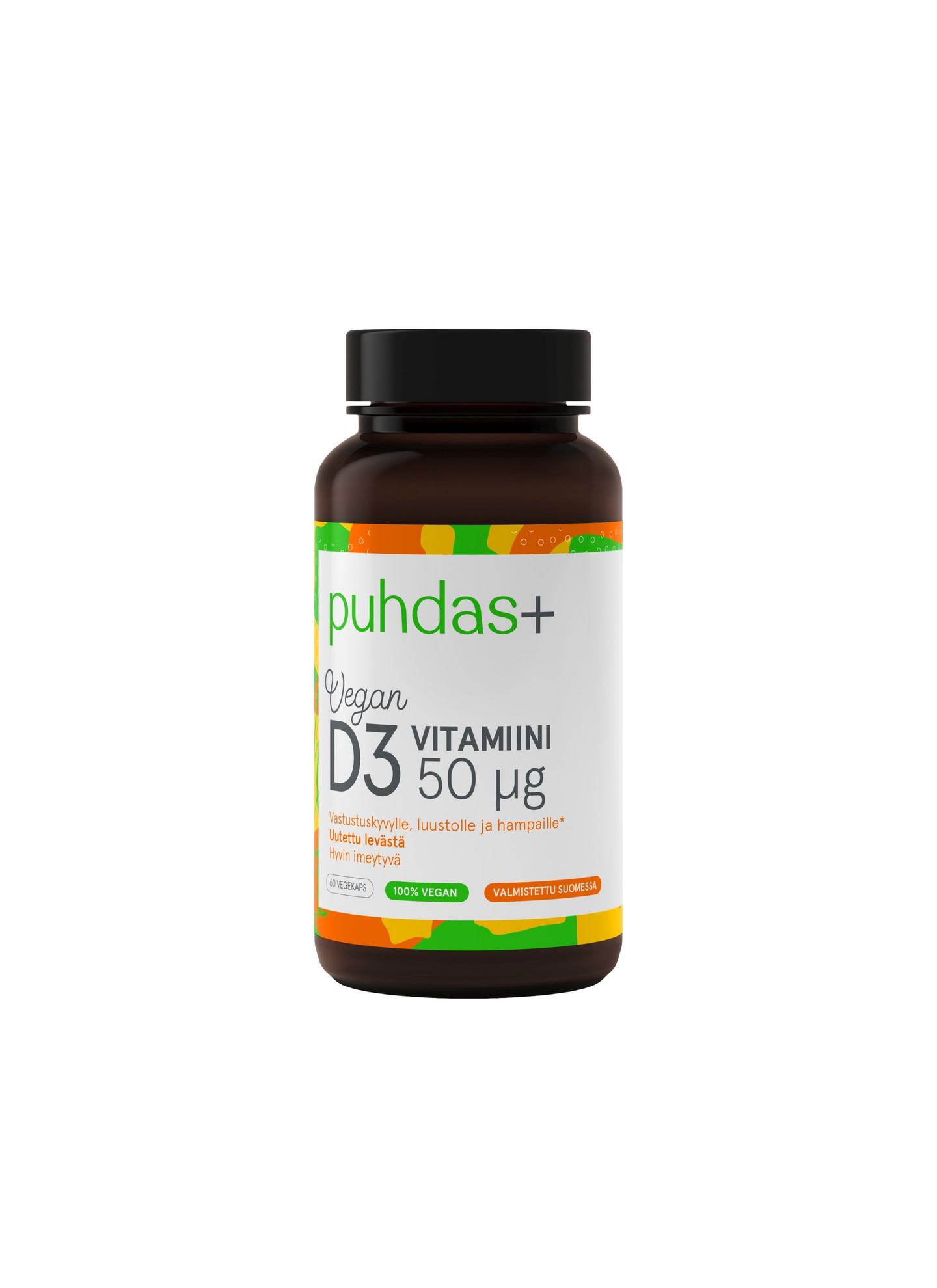 Puhdas+ Kasviperäinen D3-vitamiini on ensimmäinen kasviperäinen D3-vitamiinivalmiste Suomessa. Se sopii siis myös kasvissyöjille ja vegaaneille. Valmiste sisältää 50 µg hyvin imeytyvää D3-vitamiinia, jota tarvitsemme mm. vastustuskyvyn, luuston ja hampaiden hyvinvointiin.