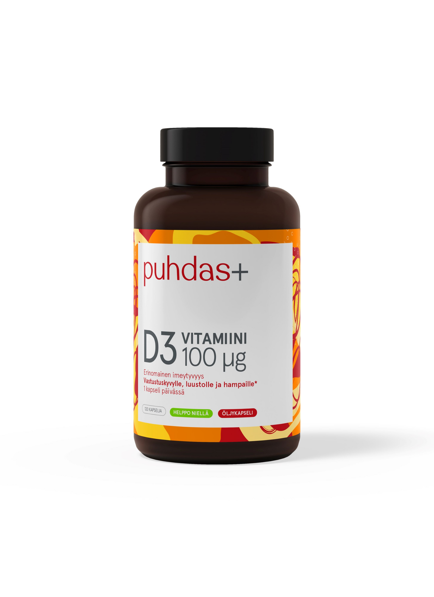 Erinomaisesti imeytyvä D-vitamiini! Puhdas+ D-vitamiinikapseli on pieni ja helposti nieltävä. D vitamiini on valmisteessa korkealaatuisessa kylmäpuristetussa extra-neitsytoliiviöljyssä, joka tehostaa D-vitamiinin imeytymistä. D-vitamiini edistää immuunijärjestelmän normaalia toimintaa ylläpitäen hyvää vastustuskykyä. D -vitamiini edistää luuston ja hampaiden pysymistä normaaleina sekä kalsiumin normaalia imeytymistä. Tämä Puhdas+ tuote on korkealaatuinen ravintolisä. Sen valmistuksessa ei käytetä ylimääräisiä turhia ainesosia, kuten säilöntä-, väri- tai makuaineita.