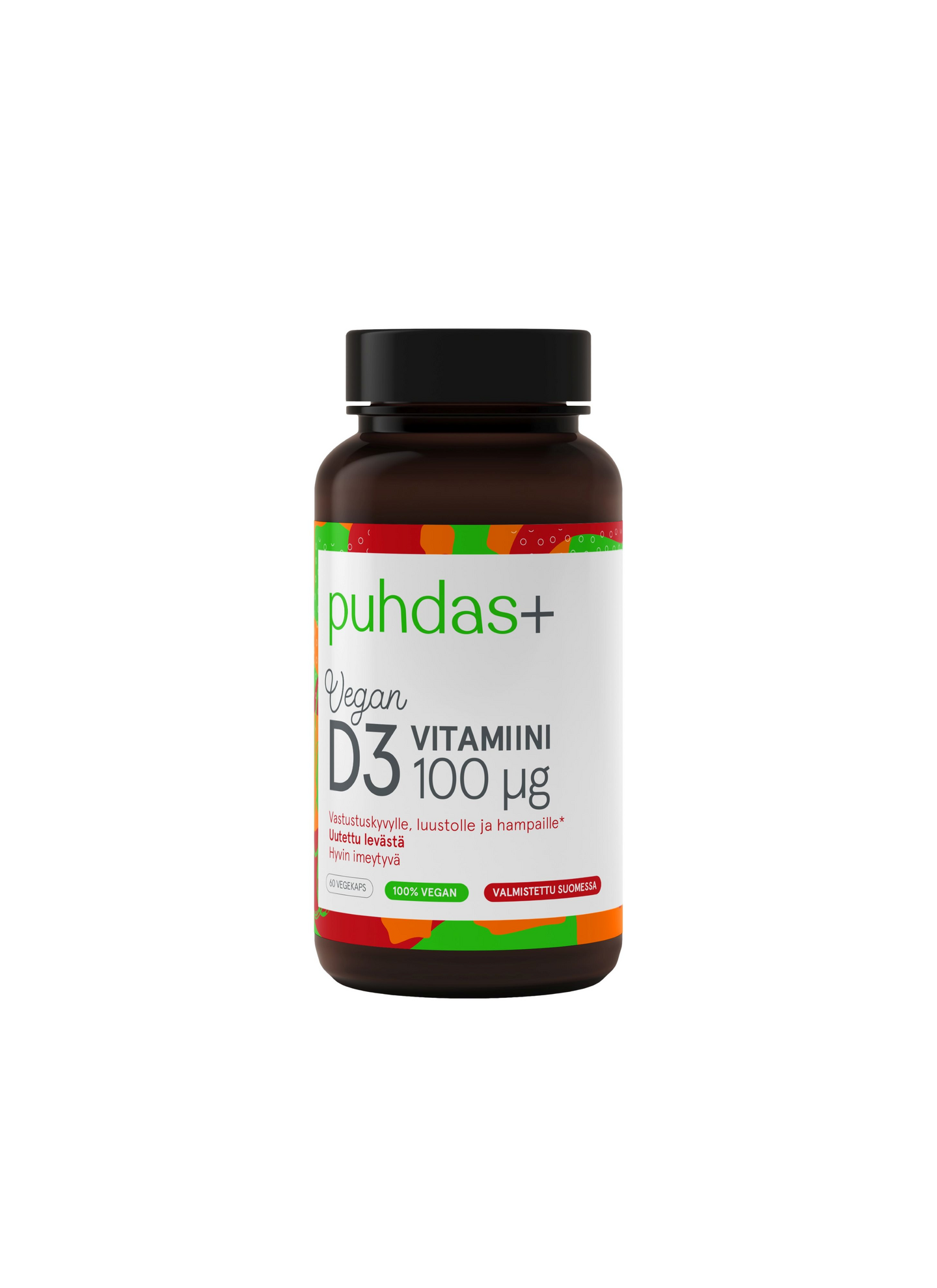 Vahva ja hyvin imeytyvä kasviperäinen D3-vitamiini! Puhdas+ D3 -vitamiinivalmiste sisältää tutkittua kasviperäistä Vitashine D3-vitamiinia. Jäkälästä uutettu D3-vitamiini on tuotteessa luonnollisessa bioaktiivisessa muodossa. D-vitamiini edistää immuunijärjestelmän normaalia toimintaa sekä luuston ja hampaiden pysymistä normaaleina.