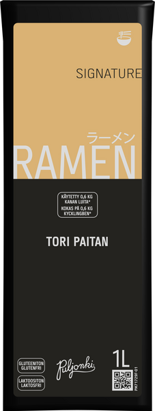 LaktoositonPuljonki® Signature Ramen Tori Paitan on aito ja maukas Paitan Ramen -liemi. Se on kehitetty aitoutta silmällä pitäen, ja tämä kermaisen täyteläinen, kananpohjainen keitto tarjoaa runsaan mutta tasapainoisen makuprofiilin, jossa on vivahteita kombusta, misosta ja chilistä.