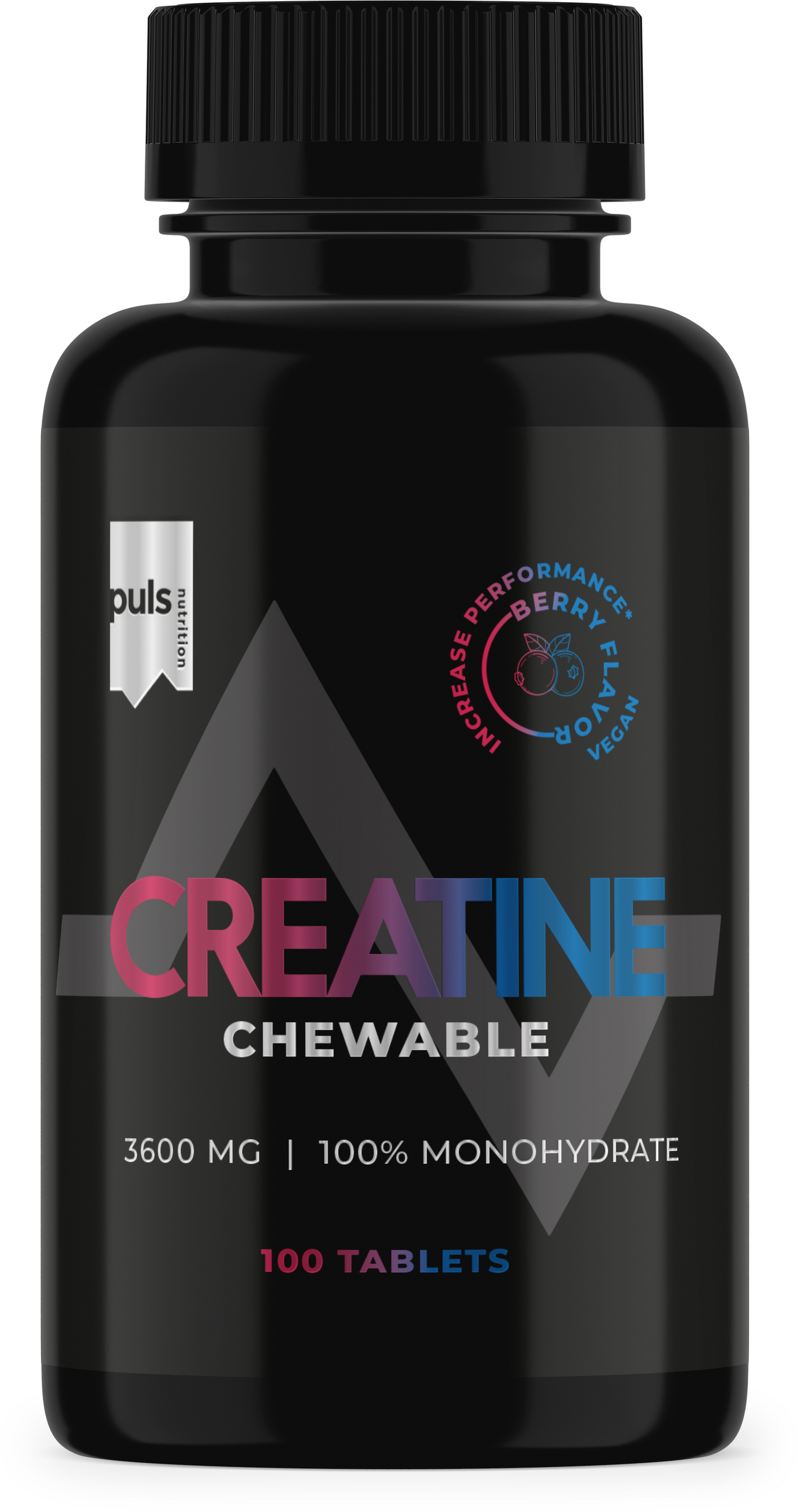 Pureskeltava PULS Kreatiini on helppo vaihtoehto kreatiinijauheille. Päiväannos sisältää 3 g kreatiinia, joka lisää tutkitusti suorituskykyä korkeatehoisissa harjoituksissa. Kreatiinia esiintyy luonnostaan kehossamme ja se toimii välttämättömänä energialähteenä lihassupistukselle. Tabletit sisältävät kreatiinimonohydraattia, joka on kreatiinin ylivoimaisesti tutkituin muoto. Marjojen makuiset tabletit eivät sisällä sokeria.