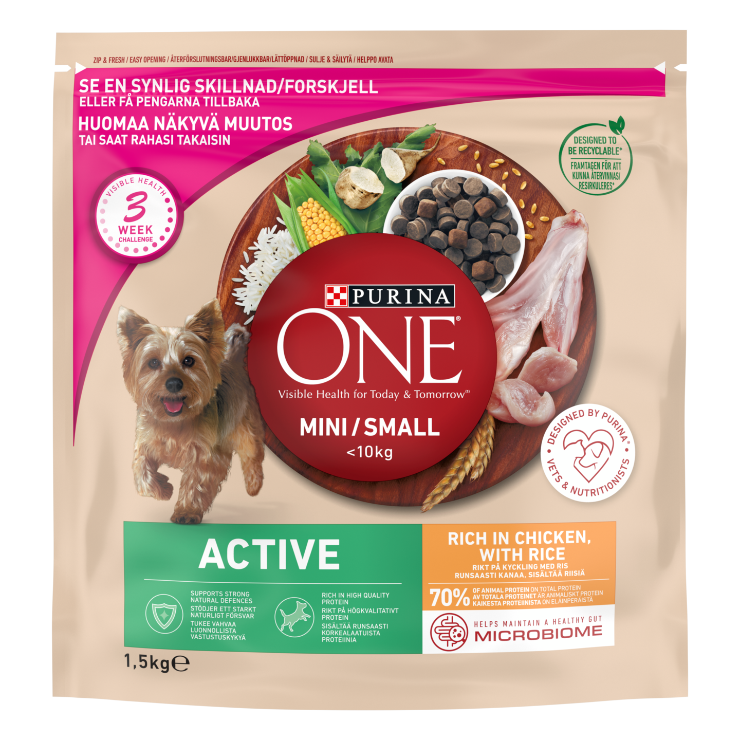 Purina ONE Small Dog <10kg Active on aikuisen koiran täysravinto, joka sopii pienille koirille aktiiviseen elämään. Herkulliset pienet rapeat pelletit ja pehmeämmät* nappulat sisältävät runsaasti korkealaatuista proteiinia & tarkoin valittuja hiilihydraatteja, jotka tukevat vastustuskykyä, ylläpitää todistetusti ihon terveyttä & turkin kauneutta ja on korkealaatuisten valmistusaineiden ansiosta erittäin hyvin sulavaa. * pehmeys vaihtelee ajan kuluessa