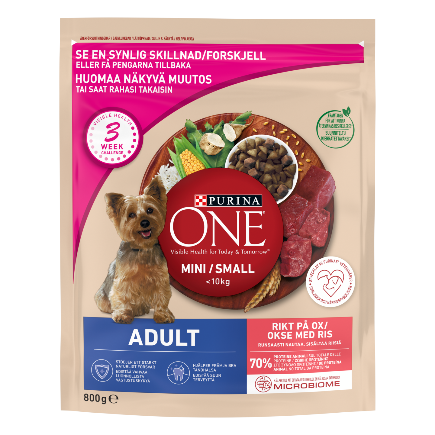 Purina One Small Dog <10kg Adult on aikuisen koiran täysravinto, joka tukee pienten koirien nopeampaa aineenvaihduntaa erityisesti mukautetulla runsaalla proteiinin ja rasvan määrällä. Välttämättömät ravintoaineet ja rapeat pelletit edistävät ikenien ja hampaiden terveyttä. Tukee vahvaa vastustuskykyä erityisen antioksidanttien ja korkealaatuisen proteiinin yhdistelmän avulla ja ylläpitää todistetusti ihon terveyttä & turkin kauneutta sisältämänsä tärkeiden ravintoaineiden seoksen ansiosta.