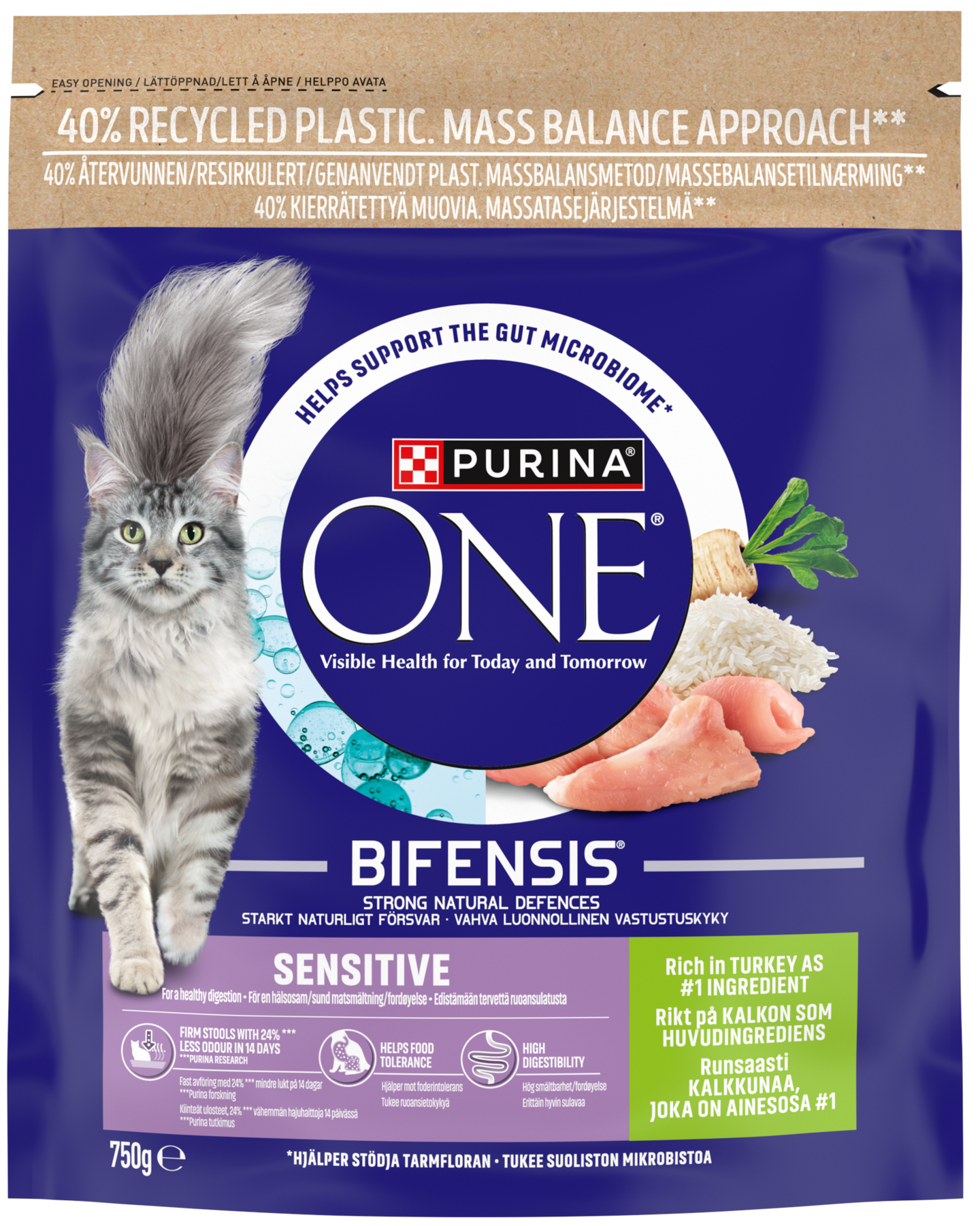 PURINA ONE Sensitive on suunniteltu erityisesti herkkävatsaisten ja valikoivan ruokahalun omaavien kissojen terveyden ja hyvinvoinnin tueksi.