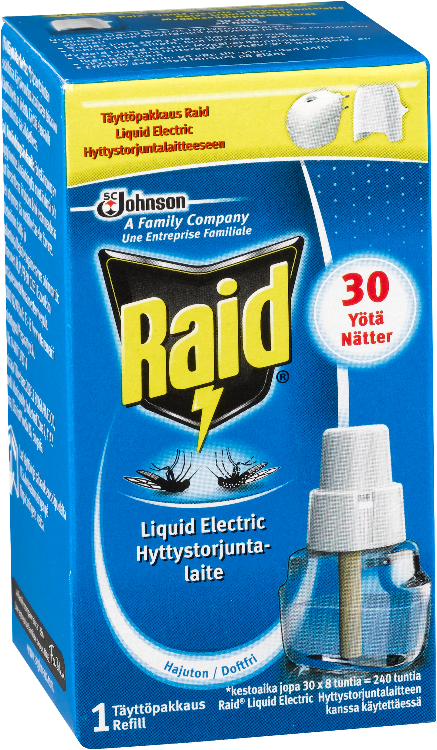 Raid Liquid Electric täyttöpakkaus sähköiseen hyttystorjuntalaiteeseen. Tuote täysin tuoksuton ja tarkoitettu hyttysten torjuntaan sisätiloissa. Laite antaa rauhan ärsyttäviltä hyttysiltä ja takaa rauhalliset yöunet. Sähköinen torjuntalaite toimii verkkovirralla (230V~). Laite kiinnitetään pistorasiaan ja laitteen lämmetessä tehoainetta vapautuu ilmaan hyttysiä karkottamaan