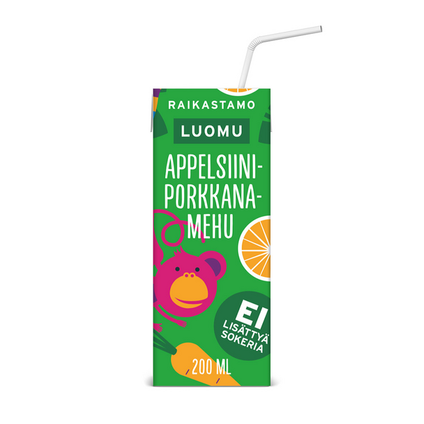 Raikastamon luomu appelsiini-porkkana pillimehu on raikas juoma, jossa ei ole lainkaan lisättyä sokeria. Mehu on virkistävä välipala ja helppo ottaa mukaan retkille ja leikkipuistoon. Täysmehupitoisuus 90 %. Säilyy avaamattomana huoneenlämmössä. LUOMU
