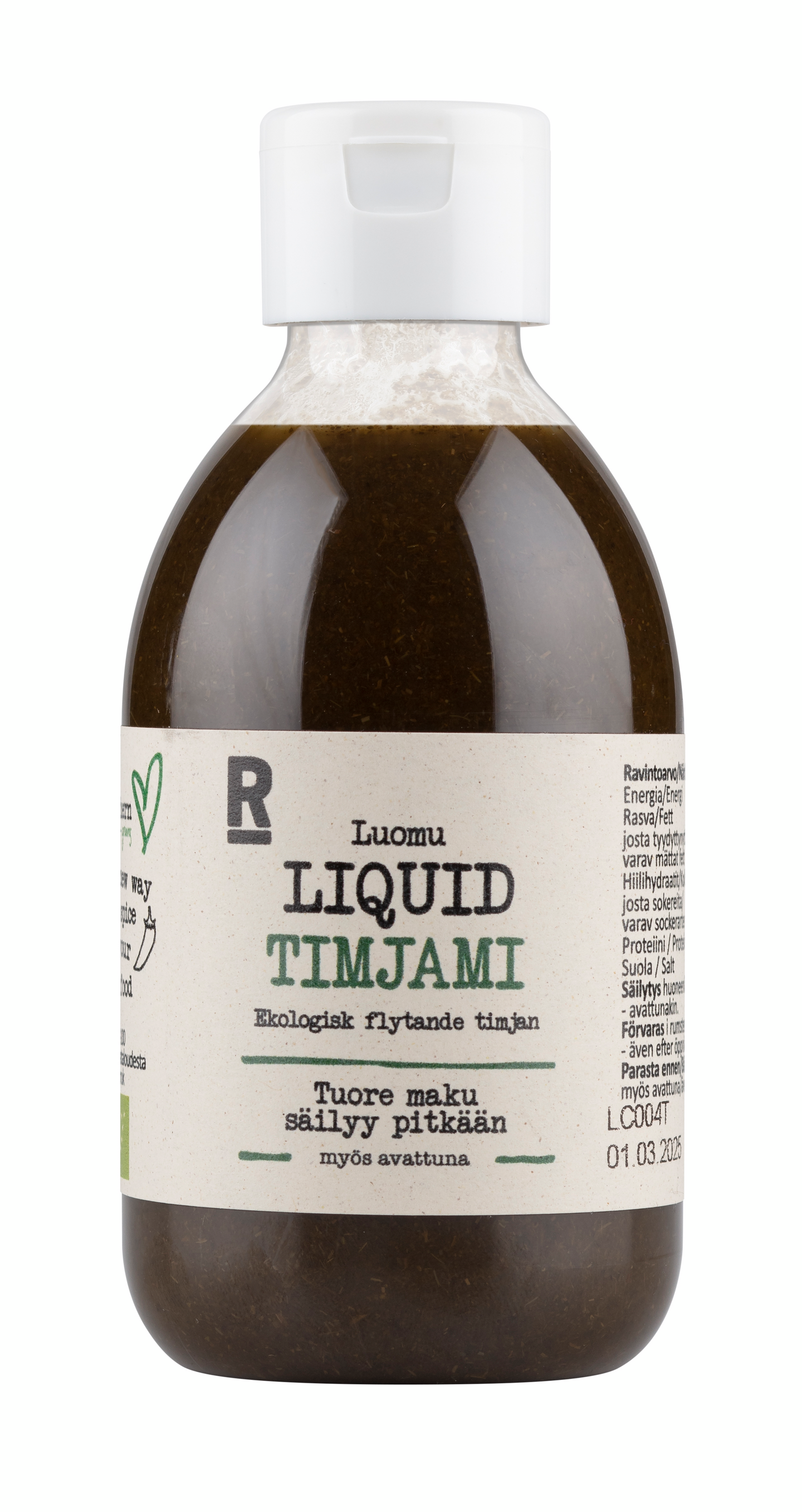Rajamäen Luomu Liquid Timjami on monikäyttöinen mauste nestemäisessä muodossa. Luomu väkiviinaetikkaan ja merisuolaan säilötty timjami säilyy avattuna huoneenlämmössä. Tuotteessa korostuvat aidot ja raikkaat maut.