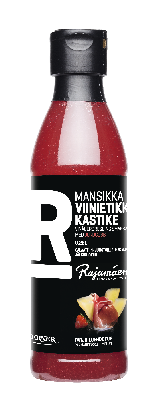 Rajamäen mansikan makuinen viinietikkakastike on makea, käyttövalmis kastike, joka on valmistettu valkoviinietikasta ja kokoon keitetystä rypälemehusta. Herkullisen punaisen värinsä kastike saa luonnon omista väriaineista, porkkanasta ja omenasta. Mansikan makuinen viinietikkakastike sopii erityisen hyvin parmankinkun ja melonin seuraksi, erilaisten juustojen lisukkeeksi, salaatinkastikkeeksi sekä jälkiruokiin esimerkiksi vaniljajäätelön kastikkeeksi tai hedelmien, marjojen ja vaahtokarkkien dippikastikkeeksi. Avattu pakkaus säilytetään jääkaapissa. Katso reseptejä: www.rajamaen.fi