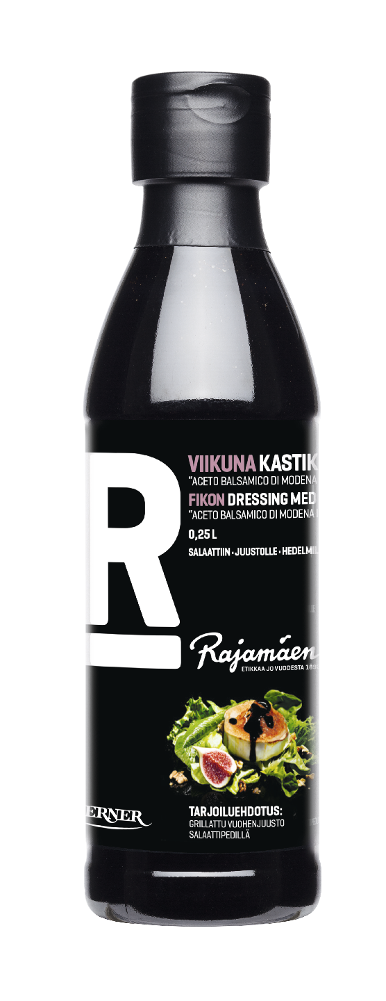 Rajamäen Viikunakastike on tumma, käyttövalmis viikunan makuinen kastike, joka on valmistettu Italiassa aidosta Aceto Balsamico di Modenasta. Viikunakastike maistuu esimerkiksi salaatissa grillatun vuohenjuuston tai halloumin lisukkeena sekä erilaisten juustojen lisukkeena. Kokeile kastiketta myös yllättävänä makuparina mutakakun kanssa! Avattu pakkaus säilyetään jääkaapissa. Katso reseptejä: www.rajamaen.fi