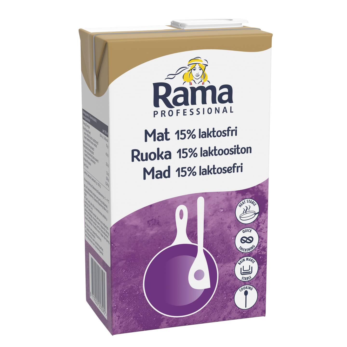 LaktoositonRama Professional Ruoka 15% on laktoositon vaihtoehto meijerikermalle ruoanlaittoon. Säilyttää oikean koostumuksen alusta loppuun saakka. UHT-käsitelty. Kylmäsäilytettävä.