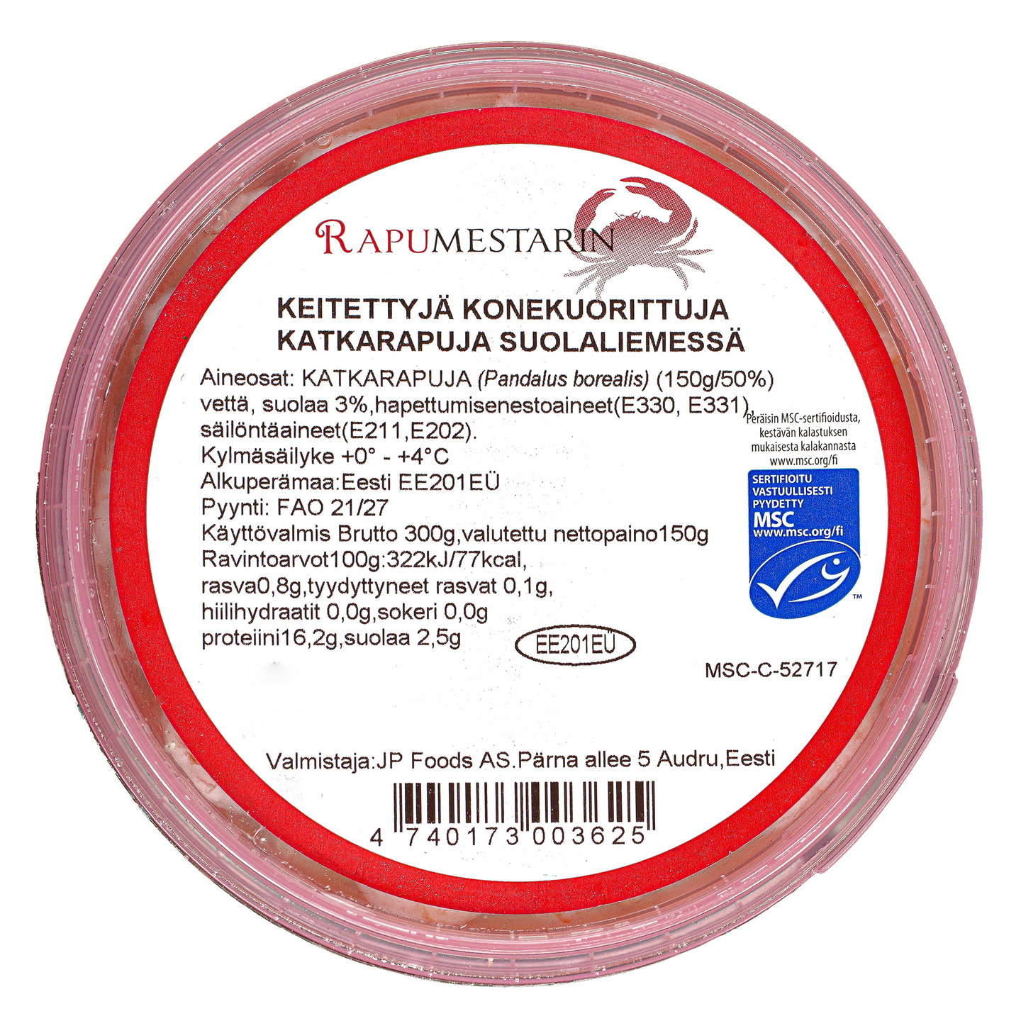 Rapumestarin keitettyjä konekuorittuja katkarapuja suolaliemessä 300/150g MSC