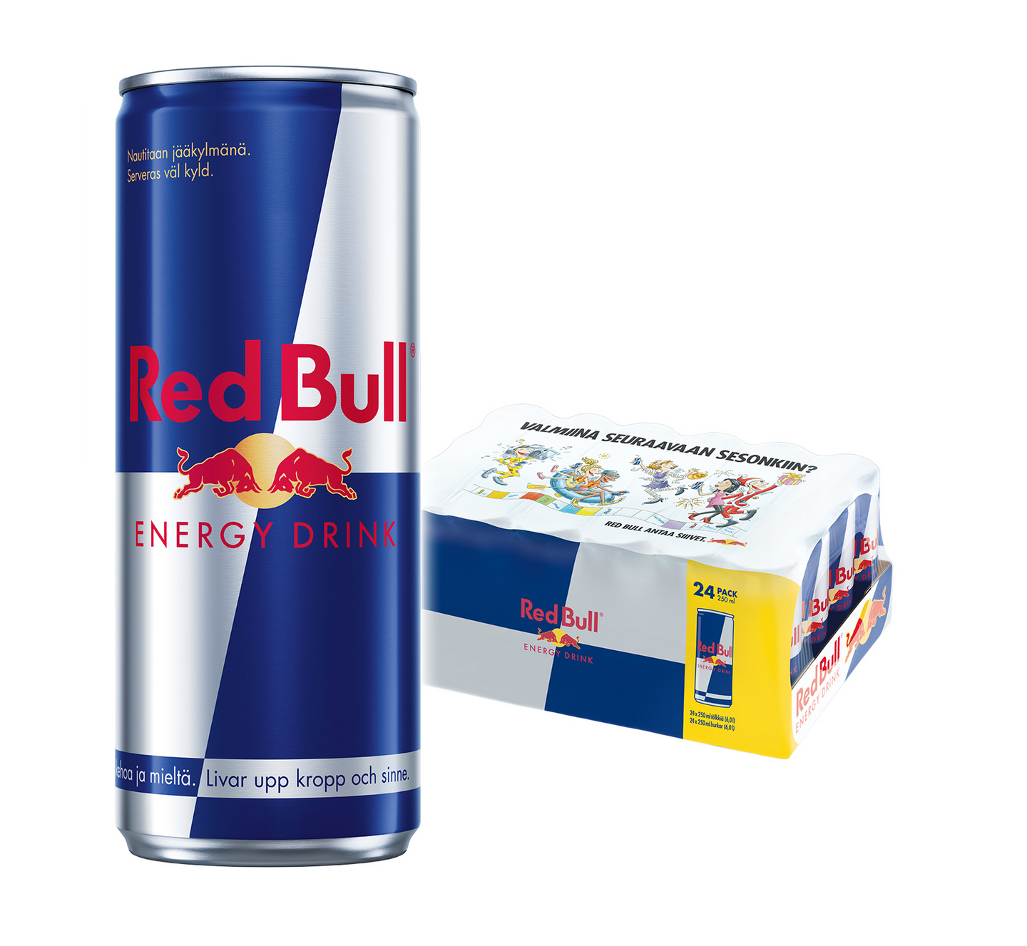 Red Bull Energiajuoma 24-pack. Tämä monipakkaus sisältää 24 tölkkiä Red Bull -energiajuomaa, joka virkistää kehoa ja mieltä ja antaa siivet, kun niitä tarvitset. Tätä energiajuomaa arvostavat niin huippu-urheilijat, kuin opiskelijat ja työntekijät vaativina työpäivinä, sekä kuljettajat pitkillä automatkoilla.