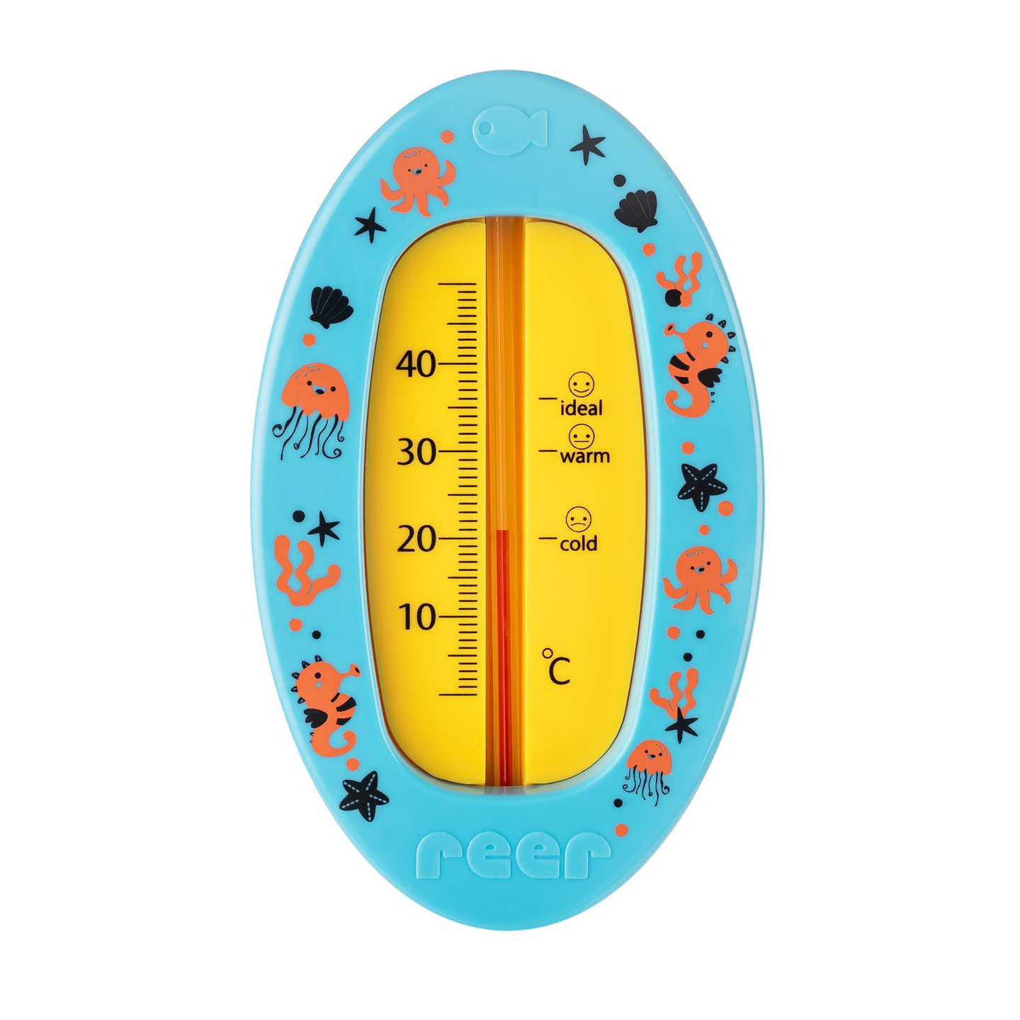 Kätevä Reer Oval Blue kylpylämpömittari lasten turvallisen ja mukavan kylpyveden lämpötilan mittaamiseen. Lämpömittarissa on selkeä näyttö jokä näyttää veden ihanteellisen lämpötilan. Mittausneste on täysin myrkytön sekä ei sisällä elohopeaa. Turvallinen tapa varmistaa lapselle mukavan lämpöisen kylpyveden.
