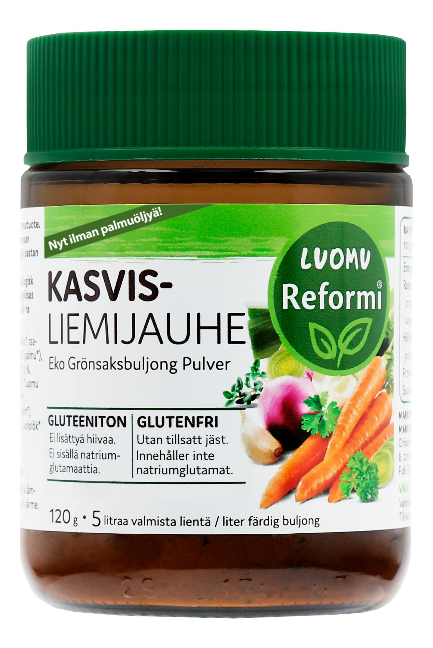 VegaaninenReformi Luomu Kasvisliemijauhe on korkealuokkainen luomutuote. Jauhetta on helppo annostella ja se liukenee nopeasti kuumaan veteen herkulliseksi liemeksi. Reformi Luomu Kasvisliemijauhe sopii keittoihin, kastikkeisiin, pataruokiin sekä riisin ja pastan keitinveteen. Jauhetta voi käyttää myös mausteena ja erilaisissa marinadeissa. Tuote on vegaaninen, gluteeniton ja lisäaineeton, eikä se sisällä palmuöljyä, lisättyä natriumglutamaattia tai hiivaa.