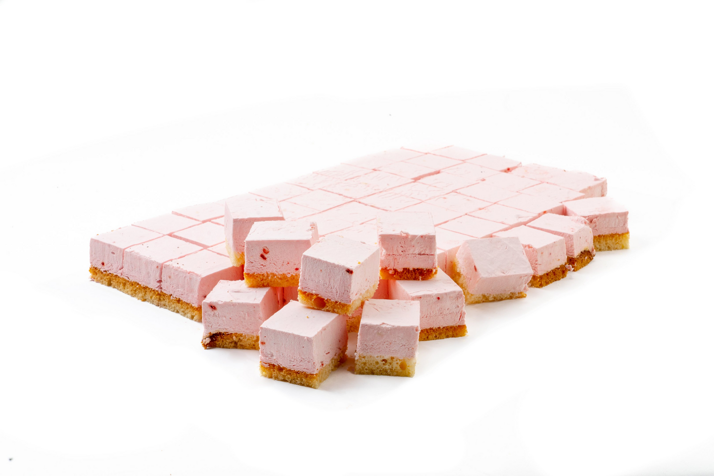 LaktoositonReuter laktoositon ja gluteeniton Mansikkakakkuaihio on valmiiksi leikattu 60 palaan. Täytteenä on mansikan makuista täytettä. Sulata ja koristele tuote ennen tarjoilua.