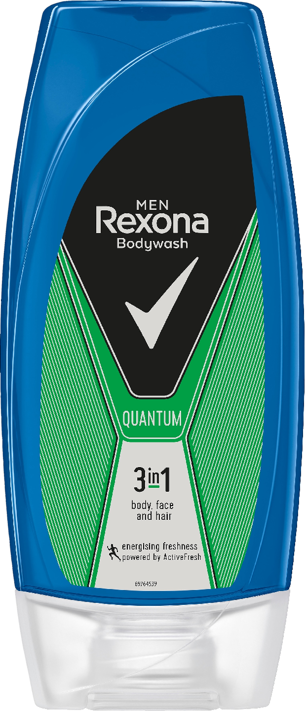 Rexona Men Quantum 3in1 on energisoiva ja virkistävä suihkusaippua ja shampoo miehille. Rexona Men Quantum on miehille tarkoitettu suihkugeeli, joka tarjoaa maskuliinista raikkautta virkistämään sekä kehoa että mieltä. Suihkugeeli jättää vartalosi raikkaaksi ja puhtaaksi päästä varpaisiin. Peset siis hiukset ja vartalon yhdellä kertaa. Et tarvitse erillistä shampoota - kätevää, eikö olekin!