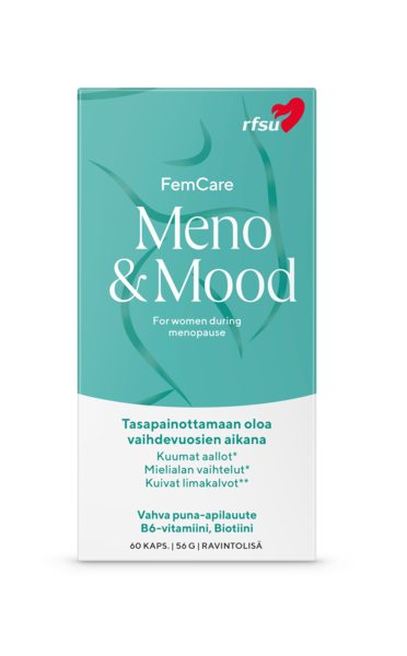 VegaaninenRFSU Meno & Mood tasapainottamaan oloa vaihdevuosien aikana, ongelmiin, kuten kuumat aallot, hikoilu, mielialan vaihtelut, levottomuus ja kuivat limakalvot. Ainutlaatuinen yhdistelmä puna-apilaa, B6-vitamiinia* & biotiinia**. Sisältää vahvaa puna-apilauutetta ja tarjoaa 80 mg vuorokausiannoksen isoflavoneita. Puna-apilauute auttaa naisia selviytymään kuumista aalloista, hikoilusta, mielialan vaihteluista ja levottomuudesta vaihdevuosien aikana. 100% vegaaninen. Ei sisällä eläinperäisiä ainesosia.