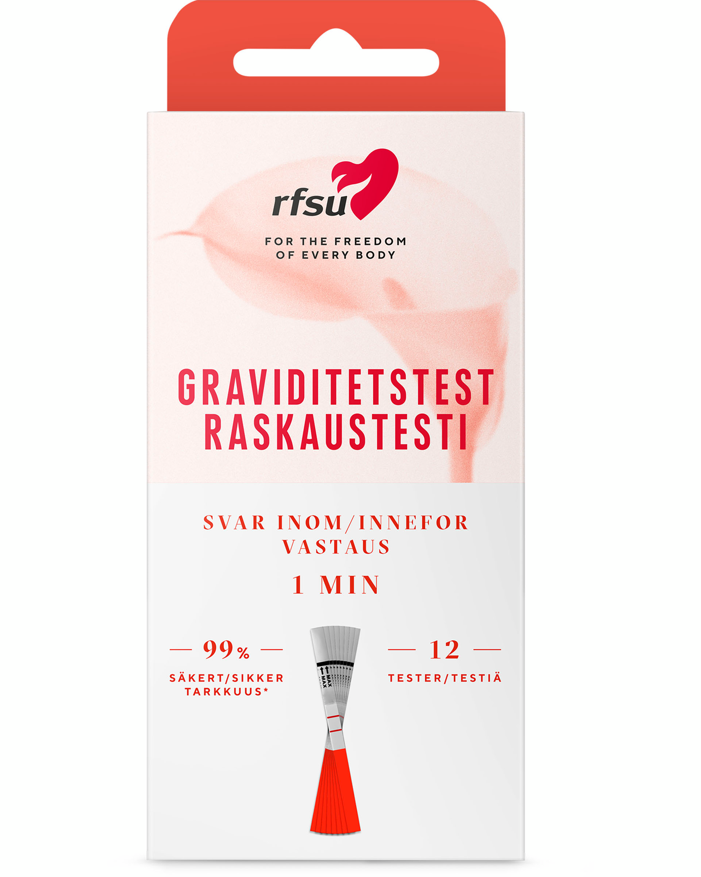 RFSU Raskaustestin avulla voit nopeasti ja helposti selvittää, oletko raskaana. Tulos ilmestyy 1 minuutissa, ja testin voi tehdä sinä päivänä, kun kuukautisten olisi pitänyt alkaa. Testin herkkyys on 25 mlU/ml hCG-hormonia virtsassa. Helppokäyttöiset testiliuskat, jotka kastetaan virtsaa sisältävään astiaan. Näyttää tulokset selkeästi yhdellä tai kahdella viivalla. Testi on yli 99 % luotettava siitä päivästä alkaen, jolloin kuukautisten olisi pitänyt alkaa. Voit testata mihin vuorokaudenaikaan tahansa, mutta turvallisinta on mitata aamuvirtsasta, jolloin hCG-pitoisuus on korkeimmillaan. RFSU Raskaustesti on samaa testityyppiä, jota kätilöt ja gynekologit käyttävät. Pakkaus sisältää 12 testiliuskaa. Lue ohjeet ennen käyttöä.