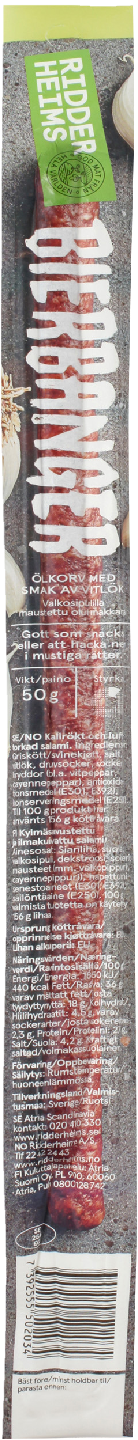 sianliha, suola, valkosipuli, dekstroosi, sokeri, mausteet (mm. valkopippuri, cayennepippuri), hapettumisenestoaineet (E301, E392), säilöntäaine (E250). 100 g valmista tuotetta on käytetty 156 g lihaa