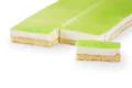LaktoositonVaalean kakkupohjan päällä mansikan ja raparperihillosta tehty moussetäyte. Kakun päällä raparperimehusta tehty kiille. Leikattu valmiiksi 20 suorakaiteen muotoiseen palaan, 'a 75 g. Valmis pakaste, vain sulatus. Laktoositon.
