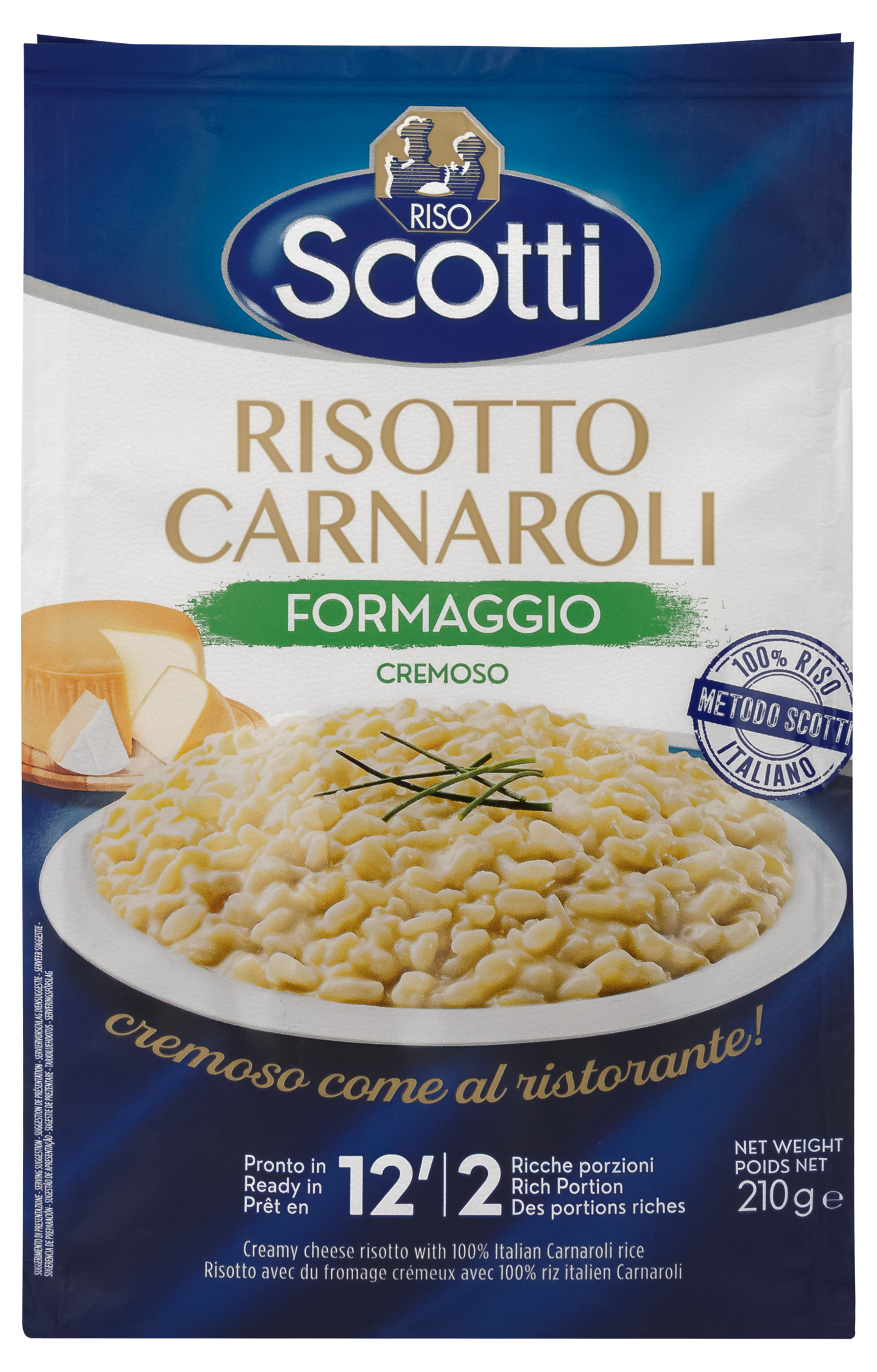 Carnaroli riisi 83,7%, riisijauho, juustojauhe valmiste 5% [HERA, juustojauhe 41% (MAITO, suola, juoksute, HERA), suola, aromit], luontaiset aromit, oliiviöljyjauhevalmiste (oliiviöljy, glukoosisiirappi, MAITOPROTEIINI, luontaiset aromit), merisuola, sipuli, TÄYSMAITOJAUHE, valkosipuli. Saattaa sisältää pieniä määriä SOIJAA, SELLERIÄ, KALAA, NILVIÄISIÄ, ÄYRIÄISIÄ, SULFIITTIA ja KANANMUNAA.