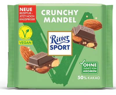 VegaaninenIhanassa Ritter Sport Crunchy Almond vegaanisessa suklaalevyssä maistuu paahdetut kokonaiset mantelit ja rapeat kvinoalastut, jotka ovat päällystetty miedolla, kermaisella tummalla suklaalla. Vaikka et olisi vegaani, voit kokeilla tätä puhtaalla omallatunnolla. Tämä Ritter Sport suklaalevy on hyvää niin ihmisille että luonnolle. Levyn valmistukseen on käytetty sertifioitua kestävää kaakaota ja se on pakattu ympäristöystävällisempään paperipohjaiseen kauniiseen kääreeseen.