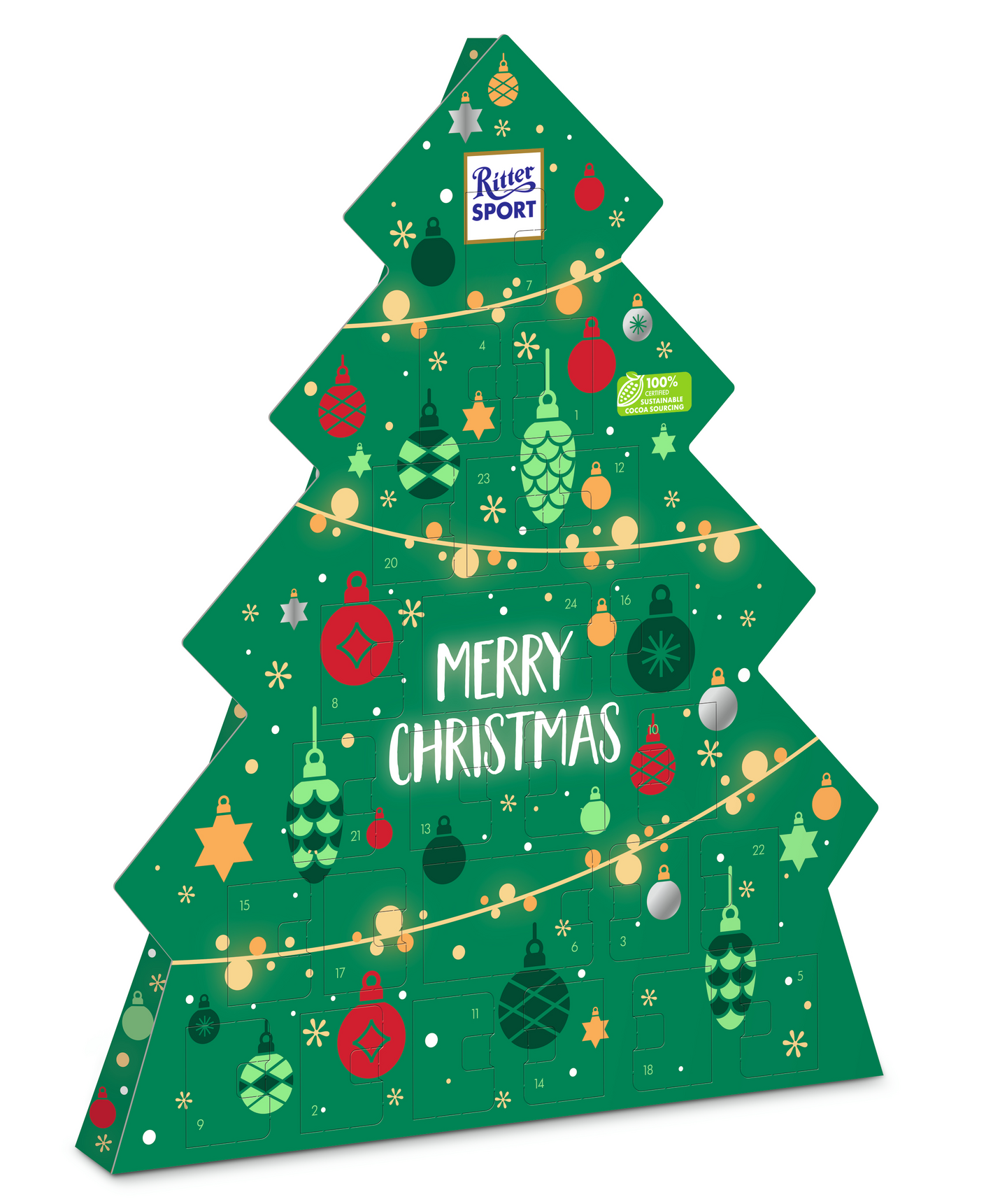 Vihdoinkin saatavilla myös Suomessa; Ritter Sport joulukalenteri! Visuaalisesti houkuttelevan kuusenmuotoinen joulukalenterin luukuista löytyvät erimakuiset yksittäispakatut konvehdit. Seitsemän uniikkia makua, joita ei ole saatavilla muualta! Kalenterissa on kätevä piikkireikä, jonka avulla kalenterin saa myös naulaan roikkumaan.